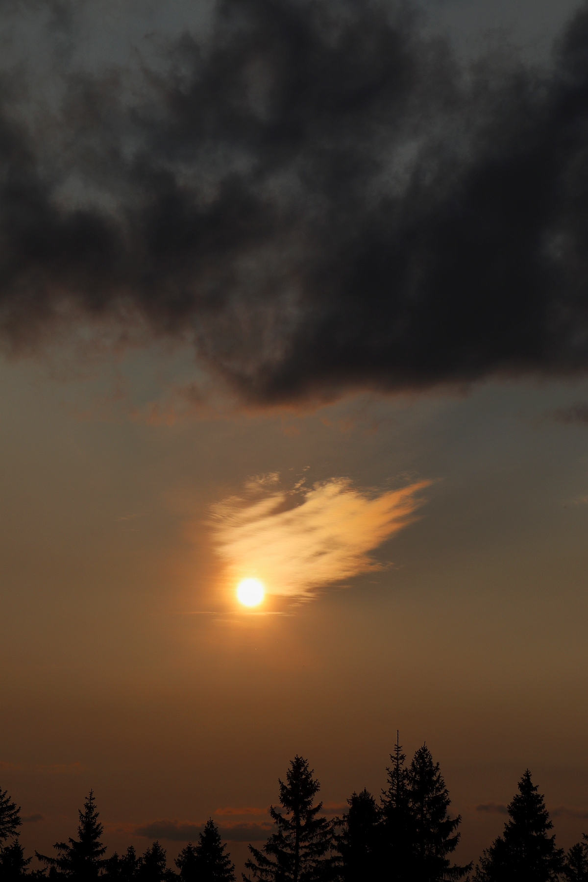 Ptáci utichli. Jen nad les se vyhoupl úplněk. Okrově zpopelavěl kouřem z dalekých lesních požárů kdesi v Kanadě. Už k večeru se v trhlině mezi temnými stratokumuly objevil oranžově svítící cirrus s okem unaveného slunce postiženého zánětem spojivek. Vzpomněl jsem si na Franze Kafku: Člověk vidí, jak slunce pomalu klesá a přece se vyděsí, když jej náhle obklopí tma. Ale měsíc přesto svítí a stoupá k zenitu.