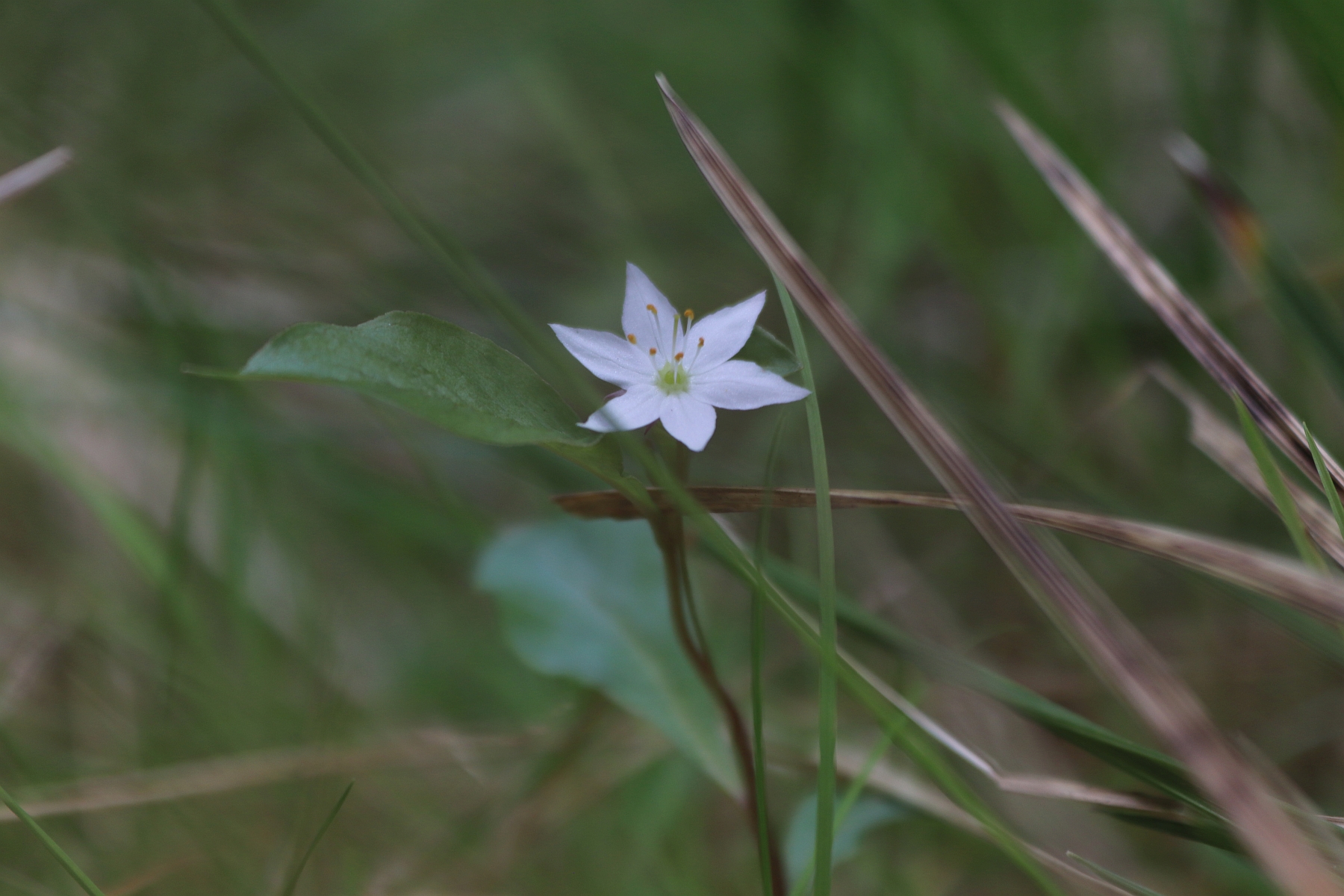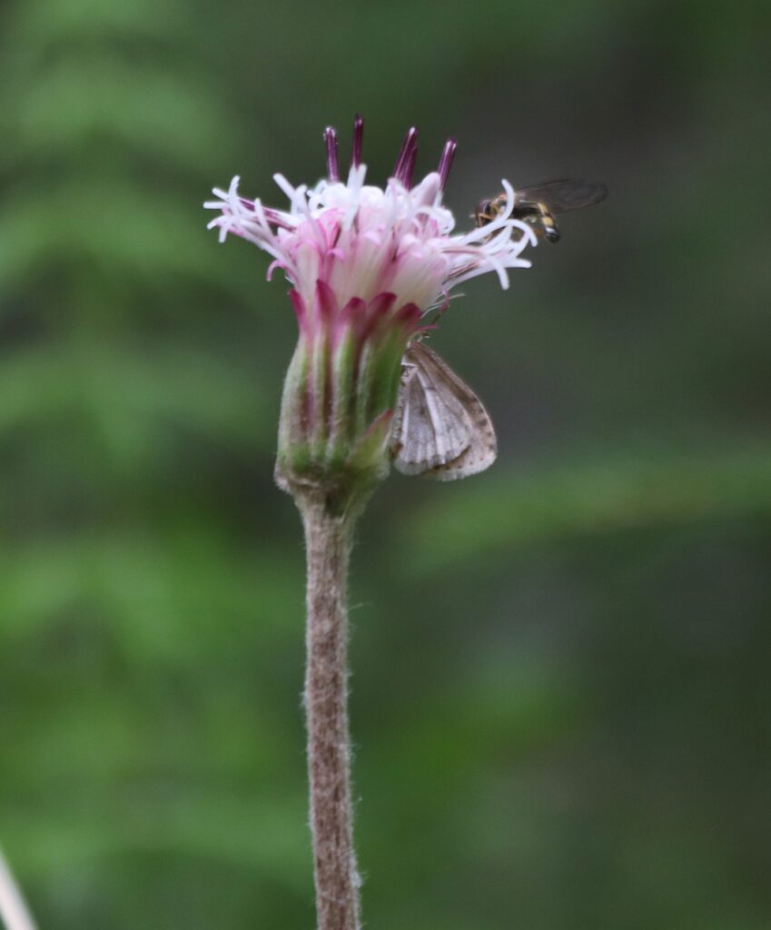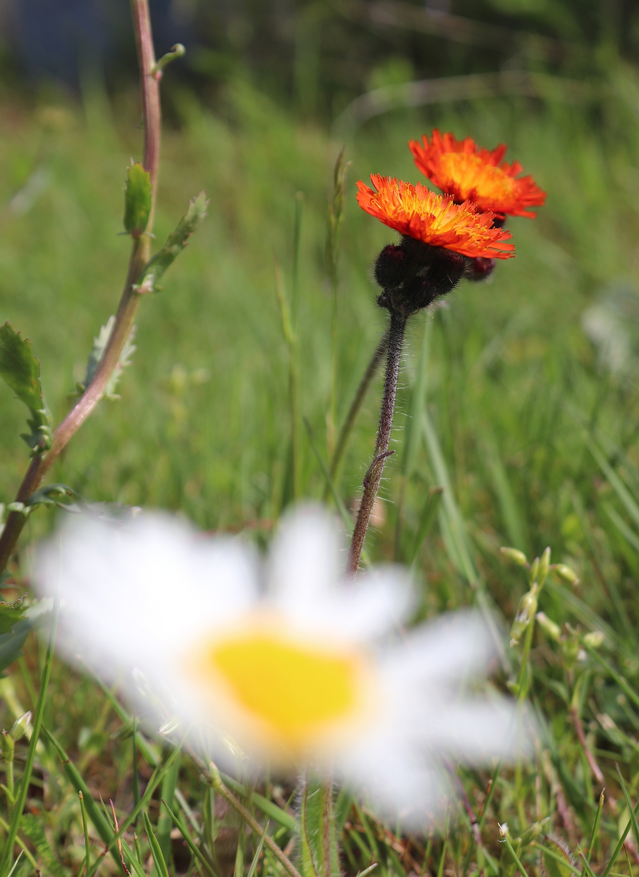 Je čas sedmikvítků evropských. Jdeme do mokřadů, kde jich vždy v červnu kvetla spousta, ale letos jsem tam objevil jediný květ. A vedle něj vytáhlý stonek podbělice alpské, na které sedí můrka a pestřenka. V míru spolu sají květinový nektar.