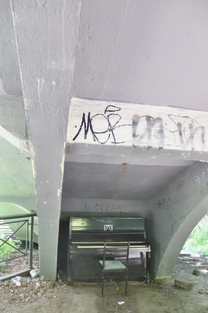 10) Klavír pod mostem pozemní lanovky v Aleji umělců nad Dněprem.