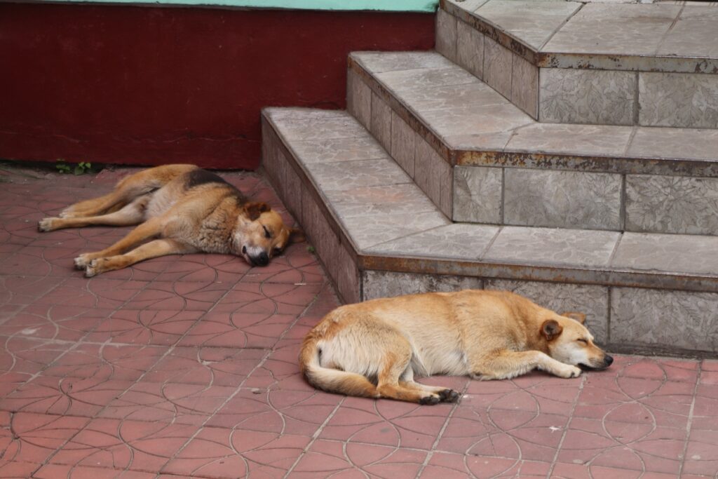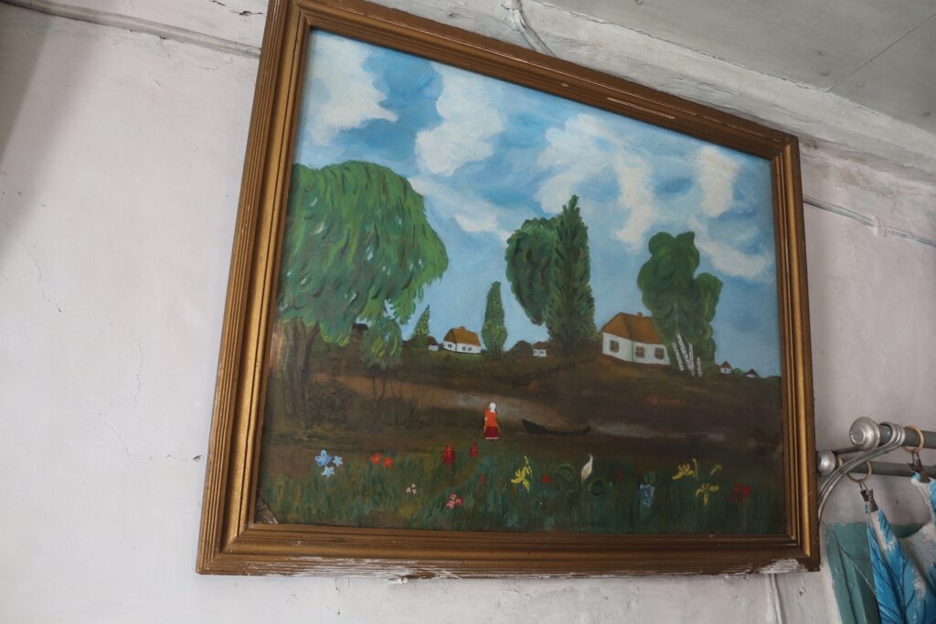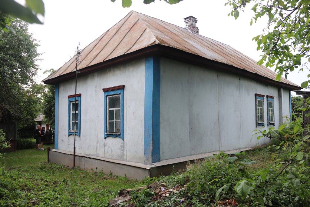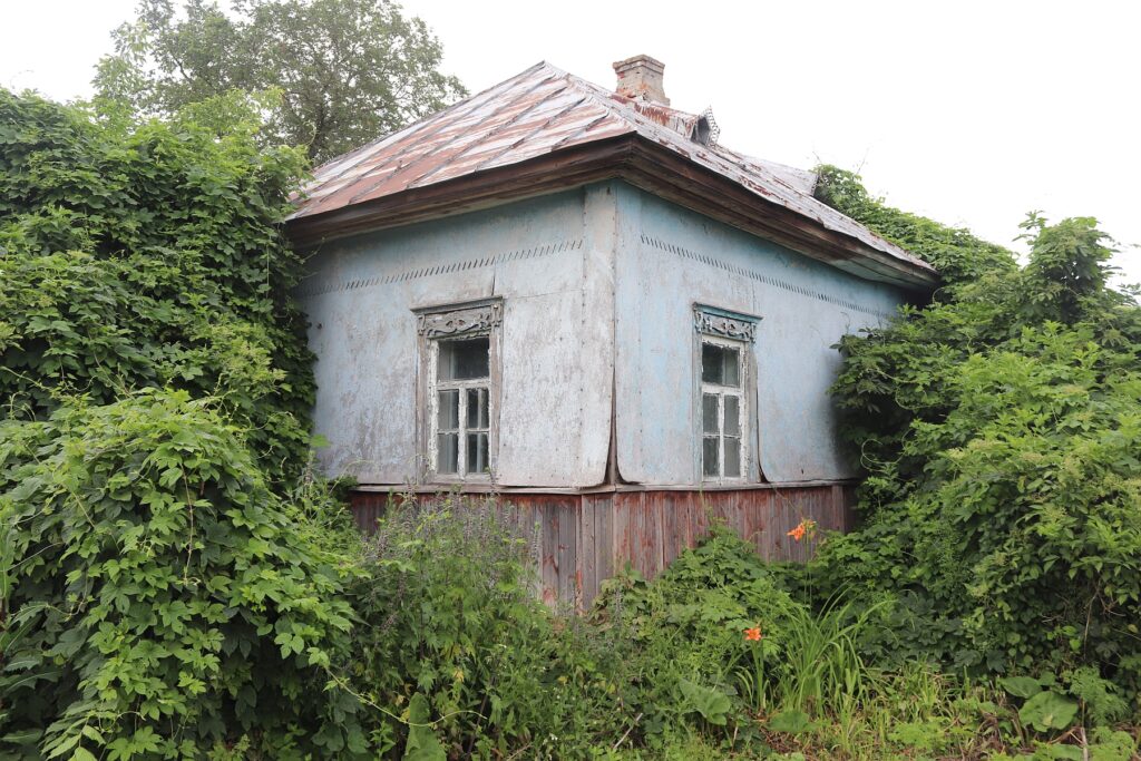 Na jedné kůlně je o střechu opřený žebřík, na něm cosi kutí dva muži. Vidím kočku na plotě, chci si ji vyfotit, ale to už starší z obou mužů slézá dolů a se slovy „Šó snimájetě?“ se ke mně hrozivě blíží. Vita si toho včas všimne a říká muži, že nefotím jeho dům, ale kočku. On nevěří, kouká na ni, na kočku. Vita mě poučuje, že si tu nemohu jen tak něco fotit, leda už opuštěné chalupy. Místní jsou nedůvěřiví, kraj je plný uprchlíků z válečné fronty. Docházíme k rybníčku a osamělému rybáři, který se za námi ani neotočí. A pak se ocitáme na křižovatce, kde stojí opuštěný magazín, před ním rostou kupodivu pěstěné, sestříhané keříky. Bolí mě klouby, šli jsme tou vsí dál a dál snad čtyři kilometry a stále nová a nová stavení se před námi zjevují. Využívám zastávky autobusu, pochybuju, že tu ještě něco jezdí. Blíží se ke mně dědula v kšiltovce, sotva šourá nohama, ale skroluje mobil. Začíná pršet, Vita a Jirka jdou napřed, já odpočívám a vychutnávám šum ukrajinského deště. Pak přidám do kroku a za chvilku oba dojdu. Už i čápům jsme podezřelí. Jeden přiletěl až k nám a posadil se na sloup elektrického vedení. Objevuje se duha.