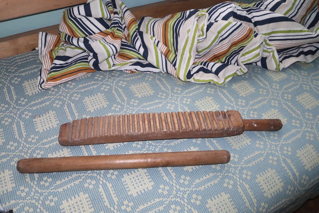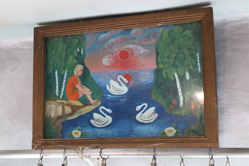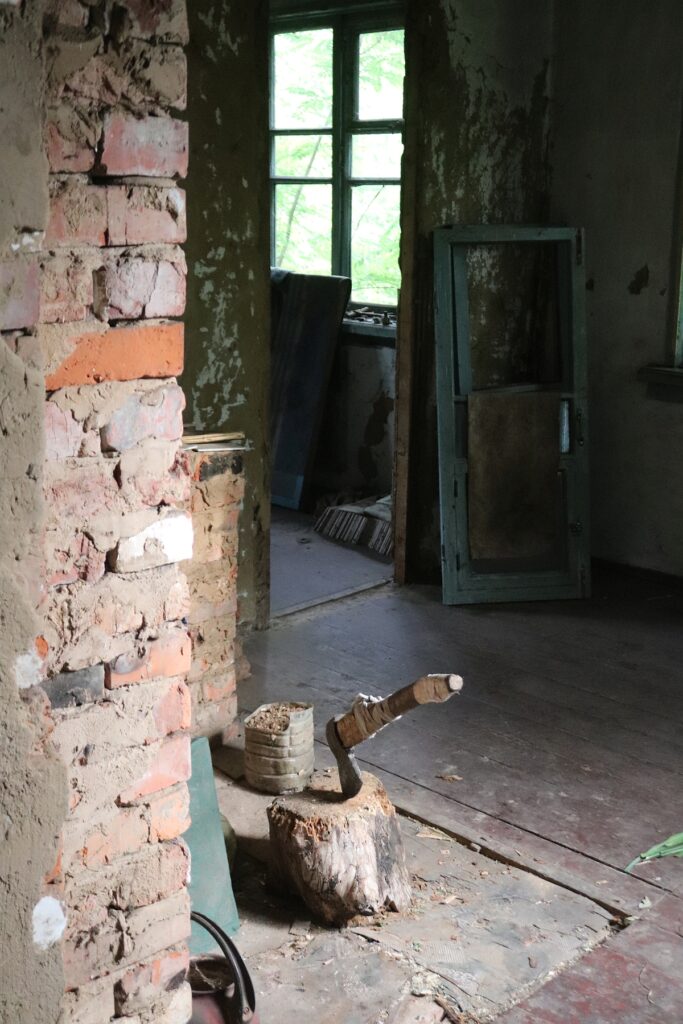 Ráno je chladno. Fouká od Běloruska. Jdu si zakouřit, kočka Gruzín mě sleduje přimhouřenýma očima. „Strášnyj ďaďko chadíl pakuríť,“ říká matka Vity. „Ďaďko ale neznamená dědek, ale strýc. Pak mi přináší rubeľ a kačaľku. Tak se pralo prádlo. Rubeľ připomíná řehtačku, ozubenou tyč, na kačaľku se namotalo prádlo. Pak se konečně vypravujeme na hřbitov. Je po dešti. Jdeme tam všichni i se sousedkou. Dáváme na náhrobek cukroví a sušenky. Maminka Vity políbila kříž. Cestou tam jsme procházeli místem, kde stávala továrna, konzervárna ovoce a udírna. Vše je zarostlé, ani cihly nezbyly, místní si je rozebrali na své stavby. Celá rozlehlá ves jako by se potápěla do zeleně, srůstala s ní, příroda si bere to, co člověk opustil.