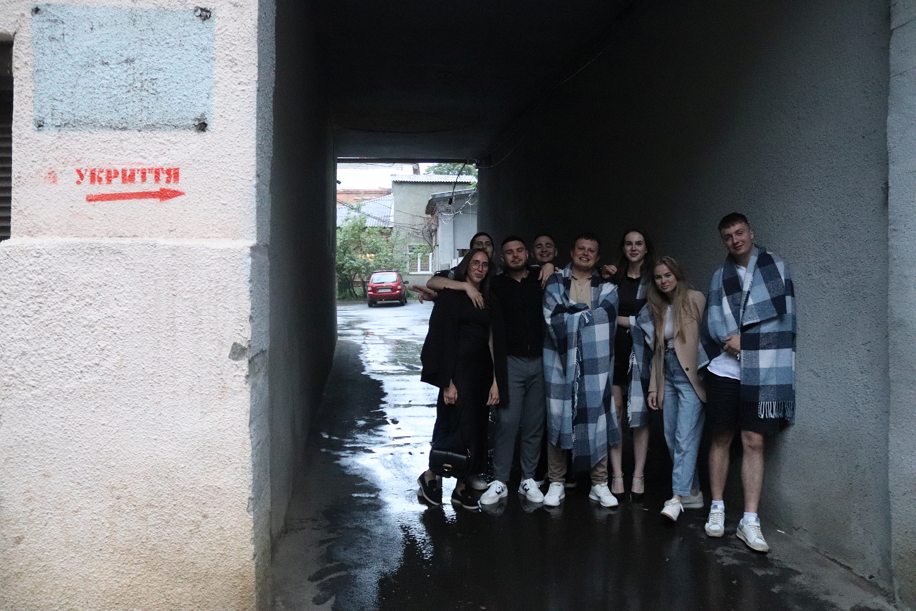 Ženou se mraky, zvedá se vítr a začíná pršet. Odjíždíme na večeři do gruzínské restaurace Buri chveni. Menu je bohaté, těžko spořádat všechny ty dobroty. Když vyjdu před podnik, vidím v podchodu stát partu mladých. Kouří tam a skrývají se před deštěm. Šipka s nápisem Ukryttje míří přímo na ně. Tak je fotím a slibuju, že jim fotku pošlu na fejs. Koukají na můj odznáček se zkříženou ukrajinskou a českou vlajkou. Mají radost, že vidí Čecha. „Ahoj!“ zdraví mě jeden z nich hrdý na to, že umí slůvko česky. Privjet!