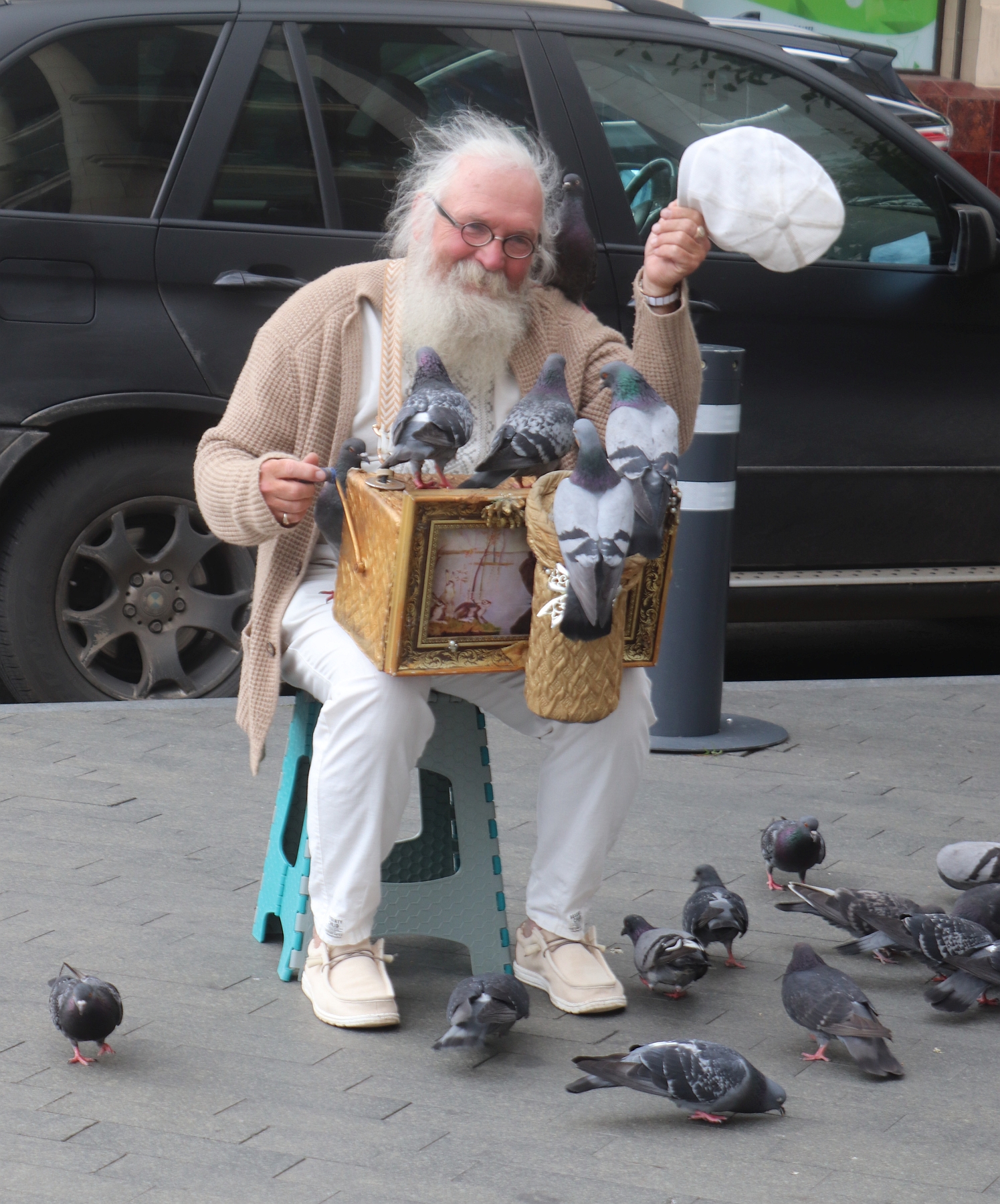 Ač na Charkov létají ruské rakety, dál se tu staví. A tak často zpoza pobořeného domu vystupuje jeřáb a roste nová budova. V poledne jdeme na jídlo do Bro–baru, kde Vita před válkou pracovala. Opět si dávám polévku okrošku a zeleninový salát se sýrem. Odpoledne se scházíme u luxusního obchodního domu Nikolskij. Prý i jemu poškodila Putinova raketa prosklenou střechu. Je plný přepychu. V přízemí na podlaze svítí velká interaktivní plocha, na které mohou hrát děti fotbal s virtuálním míčem. Dupnou na něj, míč odletí, někdy náhodně skončí v bráně. Děti to baví a pokřikují. Dívám se na ně z vyššího patra, zatímco kolem mě procházejí skupinky moderně oblečených zákazníků z vyšší společenské třídy. To není nic pro mě. Raději nechávám ostatní procházet obchody a nakupovat, jdu ven, kde sedí na židličce flašinetář v tvídovém saku obklopený holubím hejnem. Otáčí kličkou, flašinet vyhrává a holubi posedávají na flašinetu i na jeho ramenou a hlavě. Kdosi se ho zřejmě ptá, jak je možné, že se k němu holubi tak mají. „Musíte je mít rádi“, vysvětluje. Tu a tam usype holubům zrní z volné dlaně. Lidé jdou okolo a házejí mu mince do měšce na flašinetu. V té hudbě se zpomaluje čas. Muž občas obřadně smekne kšiltovku na pozdrav. Nechápu, že holubi sedají zrovna na něj. Nakonec se flašinetář zvedá, odchází k metru, židličku si bere s sebou. Holubi jej ještě chvíli doprovázejí, tak odlétají každý někam jinam.