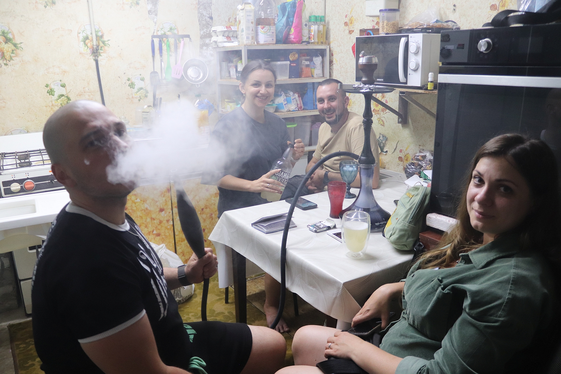15) Večer u Karyny. Vodní dýmka je v Charkově populární. Mívají ji i u stolků na zahrádkách před restauracemi.