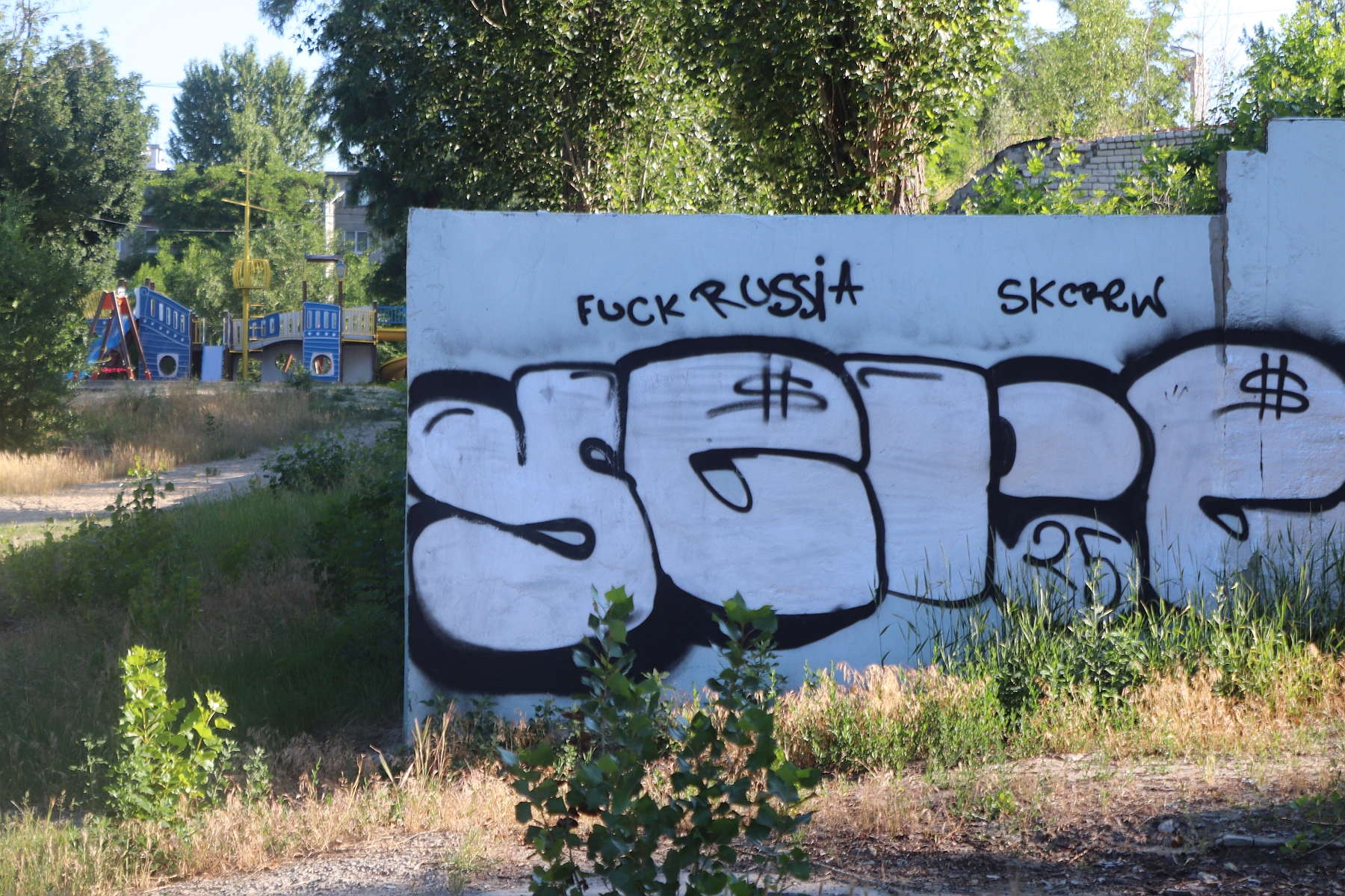 16) Vše říkající nápis Fuck Russia. V pozadí jako kontrast dětské hřiště