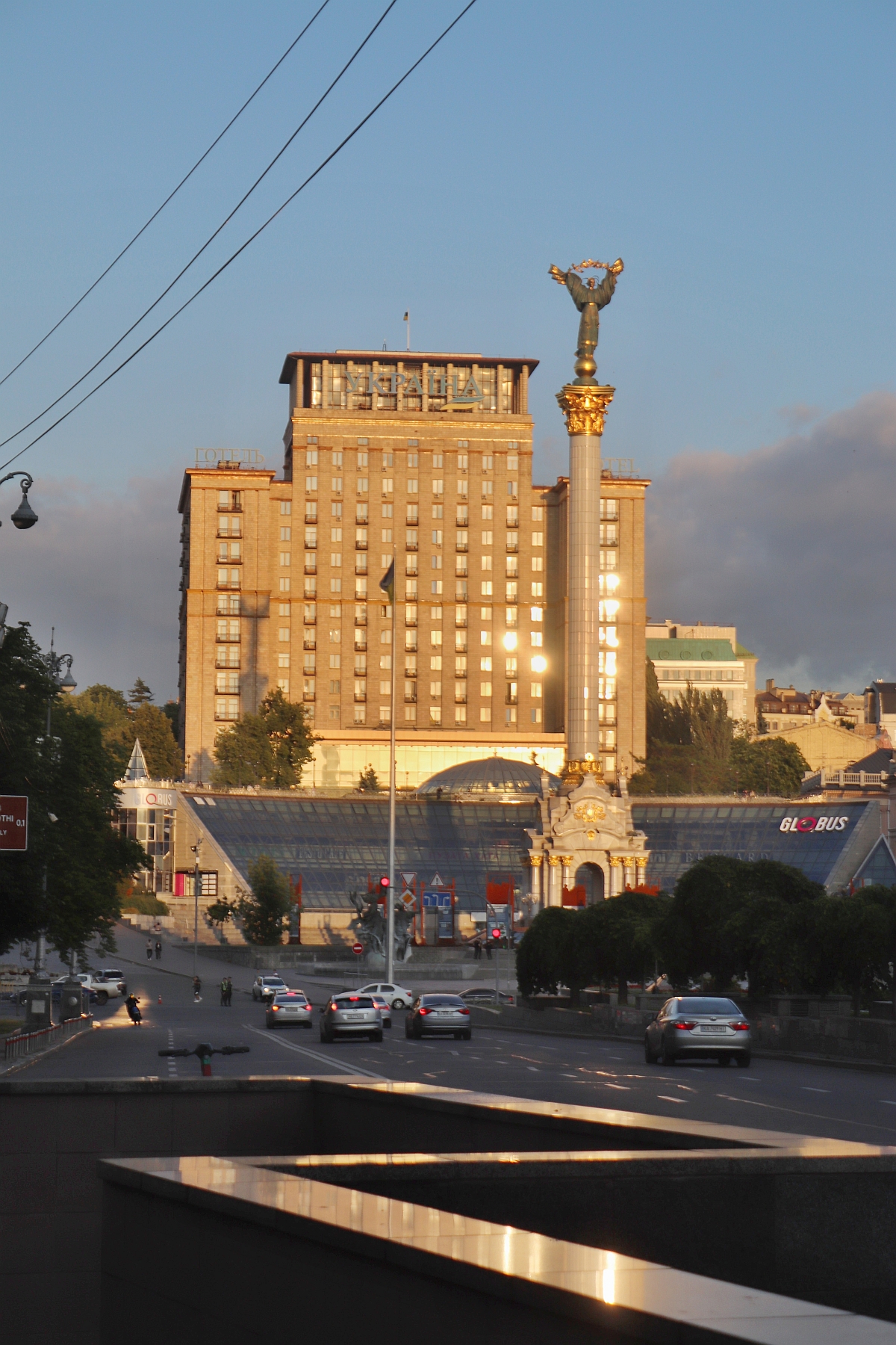 18) Loučení s Kyjevem. Západ slunce na Majdanu. Z oken vysoké budovy hotelu stříleli ostřelovači do davu demonstrujících. Nejvíce obětí přinesly dny 18 – 20. února 2014.