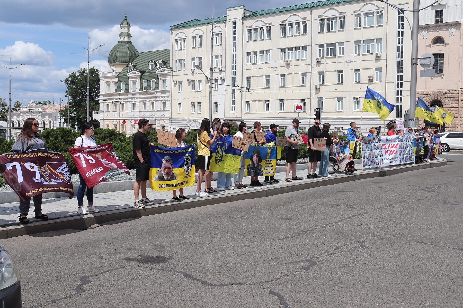 Do centra města nás veze taxikář. Na křižovatce u Historického muzea stojí po obou stranách ulice demonstranti. Většinou jsou to ženy a děti. Mají ukrajinské vlajky a provolávají hesla. Vždy něco pronese předříkávač, ostatní to sborově opakují. Volání se přelévá z jedné strany ulice na druhou: „Vraťte otce domů! Vraťte manžely domů! Vraťte hrdiny domů! Zajetí je peklo!“ Demonstrace usiluje o propuštění ukrajinských válečných zajatců, Azovců. Fotím a demonstranti, kteří se domnívají, že jsem reportér, se natáčejí ke mně tak, aby byla vidět jména zajatých. Náhle mi kmitne hlavou vzpomínka na gruzínský film Pokání z roku 1984. Ženě, které totalitní moc odvlekla neznámo kam muže, sděluje malý chlapec, že na nádraží přivezli mnoho klád, na nichž jsou údaje o jménech a možných adresách těch nešťastníků. A ženy s děvčátky se brodí bahnem a hledají na kládách sebemenší zprávu o svých blízkých. Někteří ji najdou a hladí zápis, jiné nenajdou nic, pokládají v žalu hlavu na kládu.