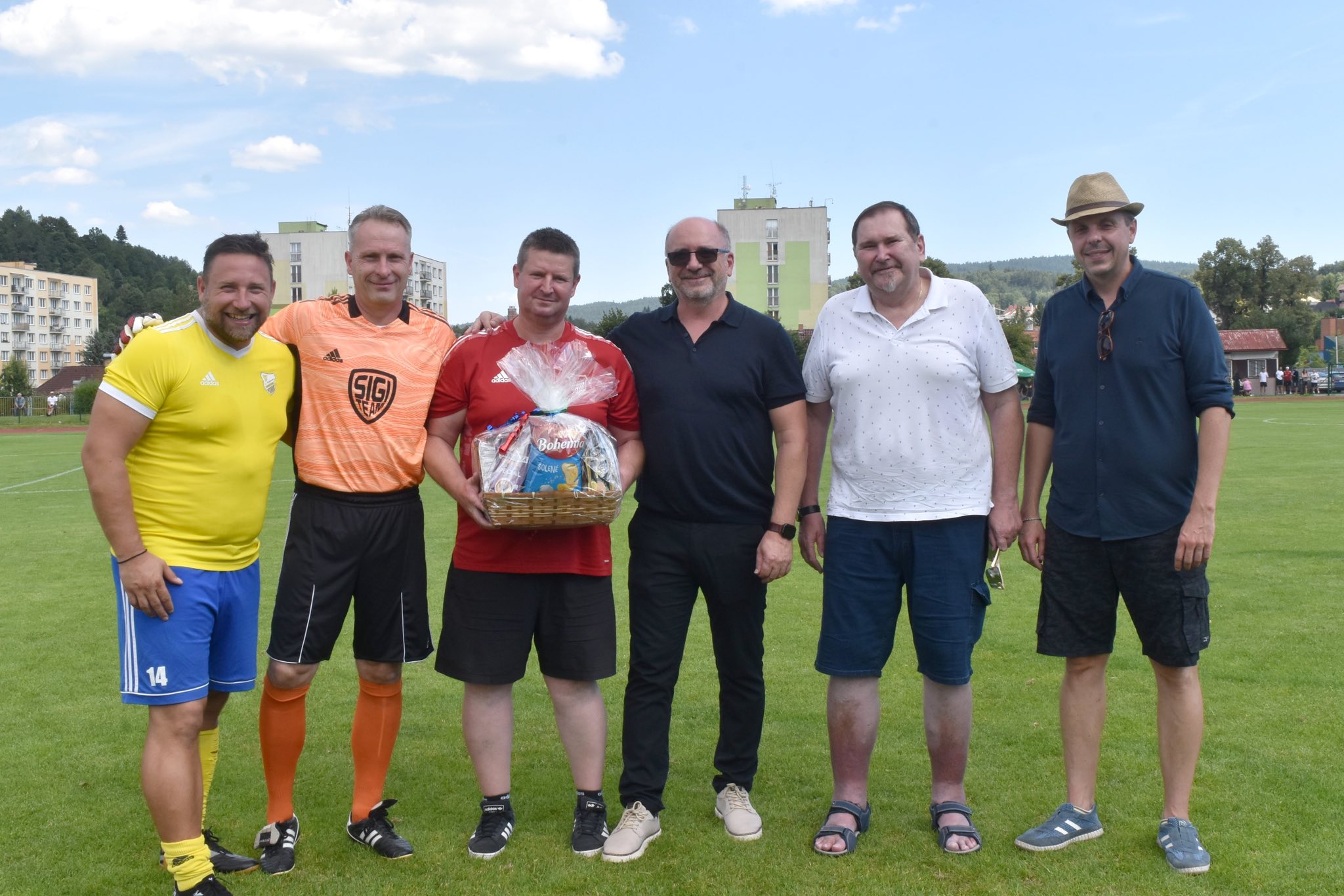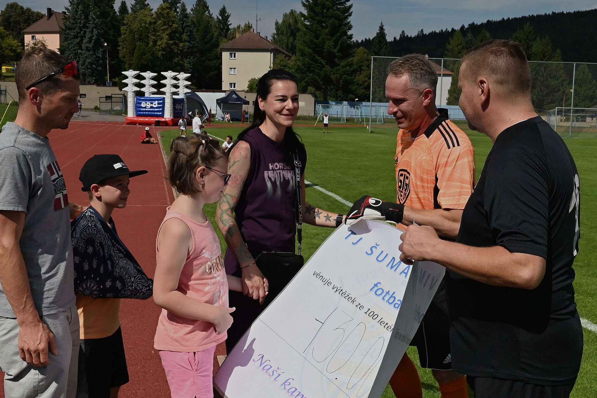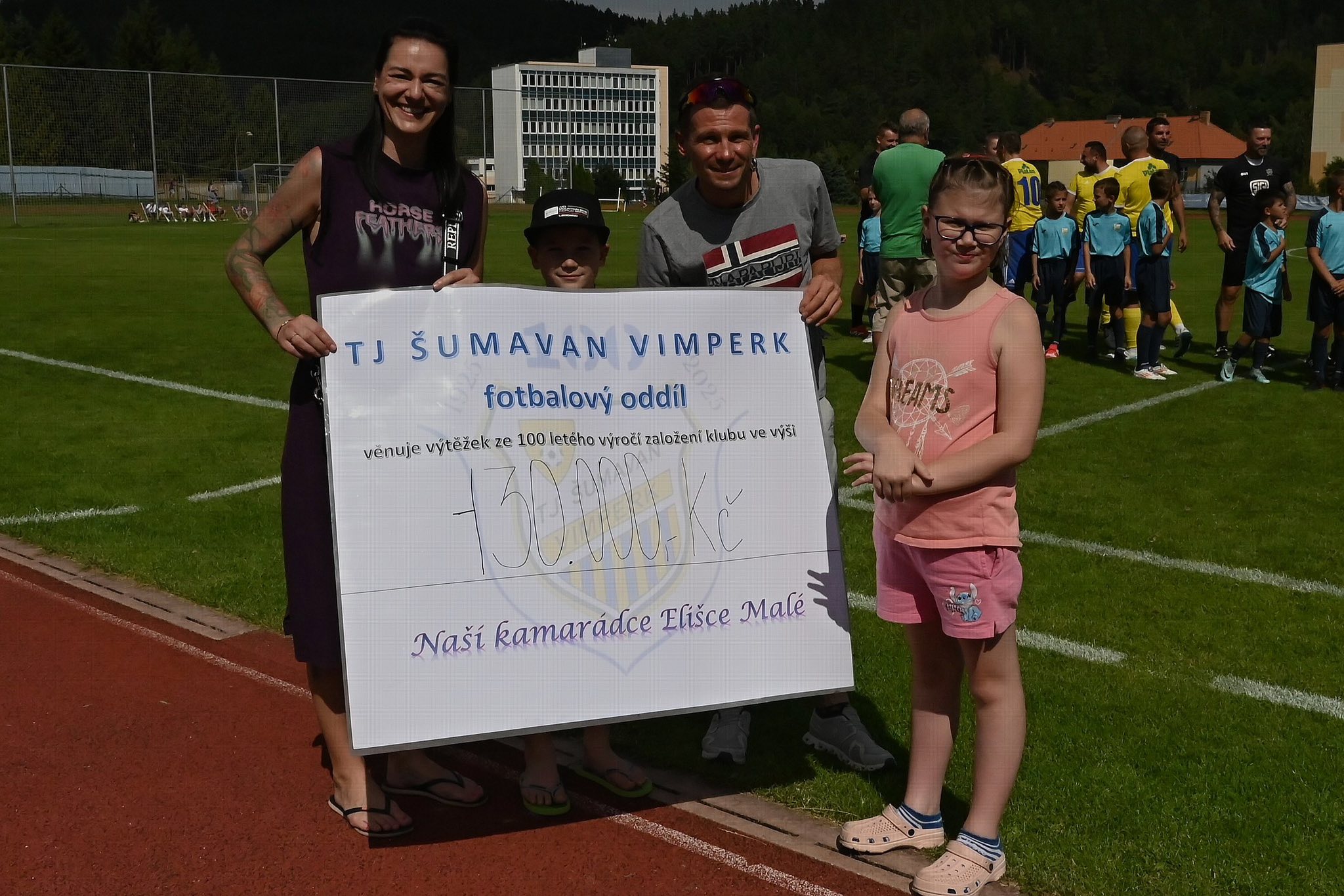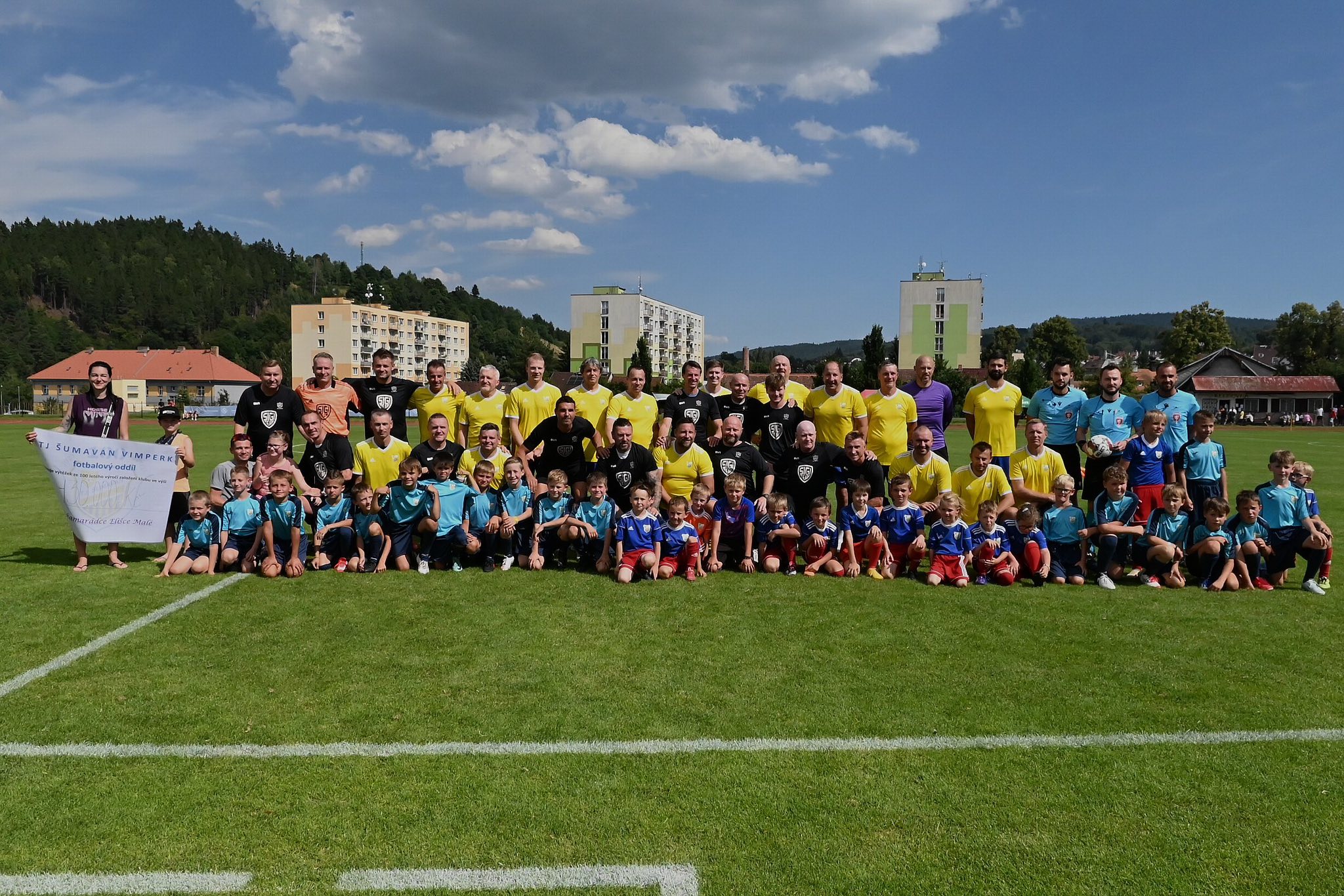 Odpolední vrchol přinesl v 15:00 zápas naší staré gardy proti Sigi Teamu. Do Vimperka zavítaly legendy českého fotbalu – Horst Siegl, Tomáš Řepka, František Straka či současný hlavní trenér české reprezentace Ivan Hašek. Před samotným utkáním jsme vzdali poctu Jaroslavovi Uhlíkovi za jeho dlouholetou práci pro klub. Následoval krásný moment: Jiří Formánek a Horst Siegl předali Elišce Malé šek na 130 000 Kč na podporu jejího boje s Primrose syndromem. Exhibiční utkání ovládl Sigi Team, byť nejtěsnějším možným rozdílem – 7:6.