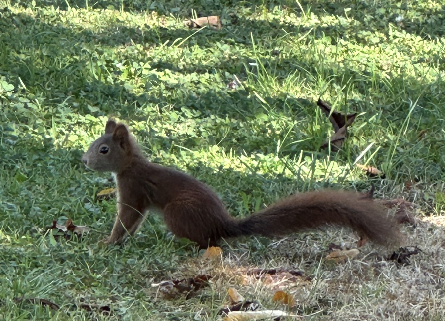 Dozrávající ořechy už lákají do zahrad veverky … ovšem potkat mezi přemírou černých i klasickou zrzavou je docela vzácností.