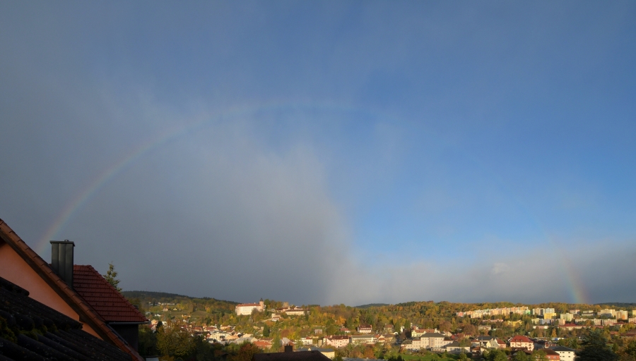 Sedmá tohoto měsíce fotokronikou zachycená duha má jistě svou obecnější výpovědní hodnotu, a to tím spíše, že jmenovaný atmosférický jev dozajista krášlil říjnovou oblohu vícekrát, než se autorovi podařilo fotograficky polapit. Ač tento konkrétně nepatřil zrovna k nejvýraznějším, přece byl po návratu ze zimního výletu nanejvýš kontrastní změnou.