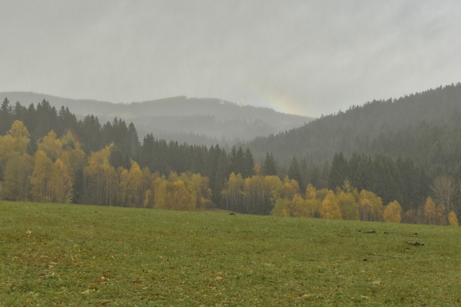 … což potvrdila i šumavská krajina o něco výš. Další rýsující se duha za situace, kdy s deštěm poletoval i sníh, …