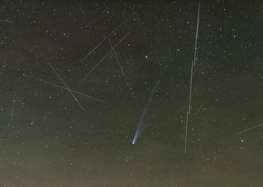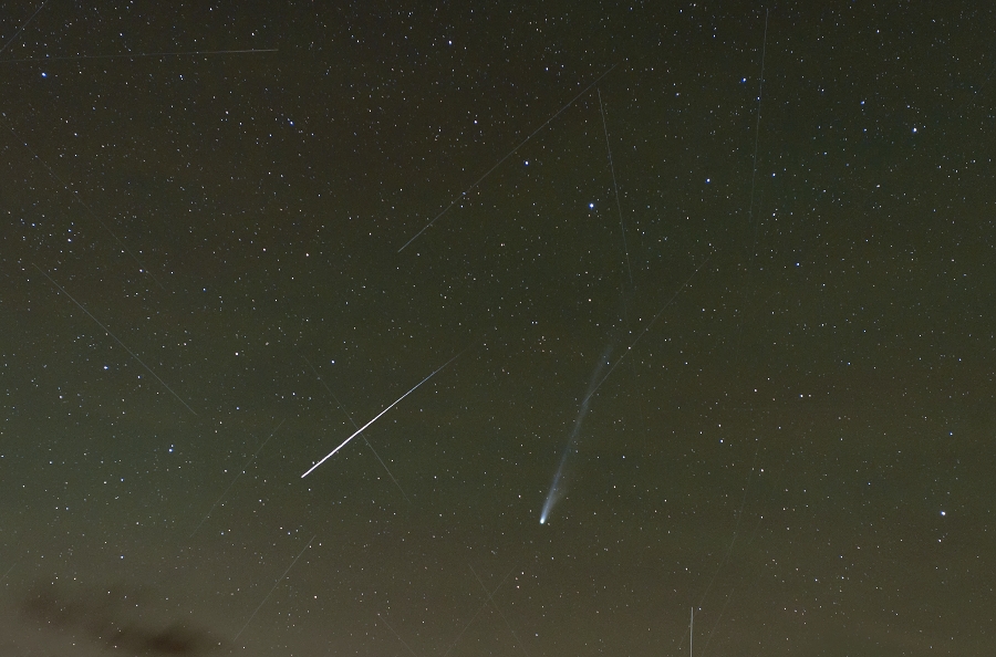 Jeden ojedinělý meteor uprostřed změti satelitních drah si dokázal na zlomek času, v němž na obloze zazářil, zahrát duo s kometou ve svém pouze optickém sousedství … ba co víc, pokusil se ve své jepičí existenci dokonce hrát první housle.