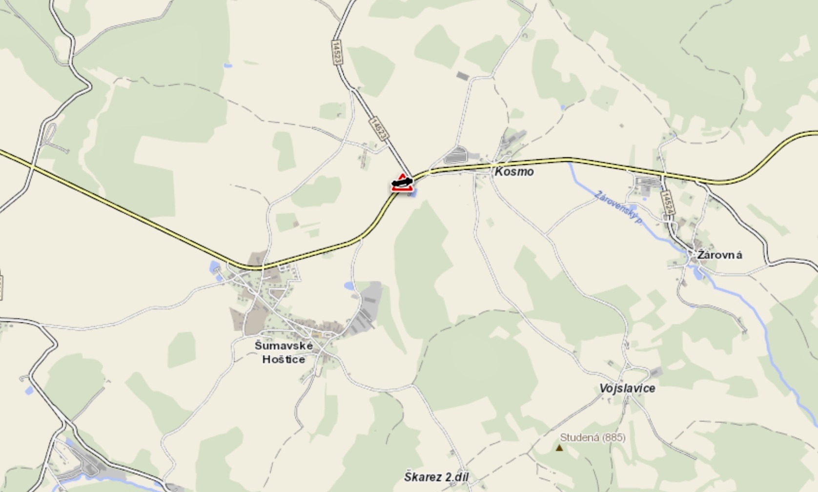 Pozor na nehodu dvou osobních vozidel na silnici 145 u obce Šumavské Hoštice okres Prachatice