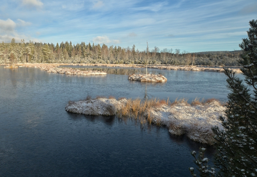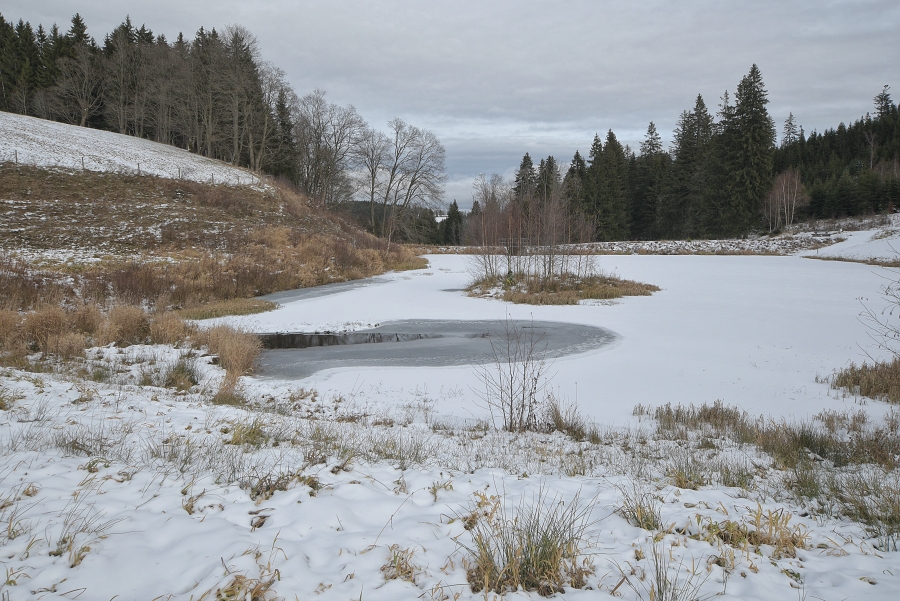 K tomu člověk občas musí umět poctivě přiznat, že ve svých odhadech jednoduše prohádal. Mrazík sice o dva stupně povolil, ale i tak postačil k tomu, aby jezírko na Chalupské slati oproti předpokládanému návratu do podzimní podoby naopak skutečně v celém viditelném rozsahu zamrzlo.