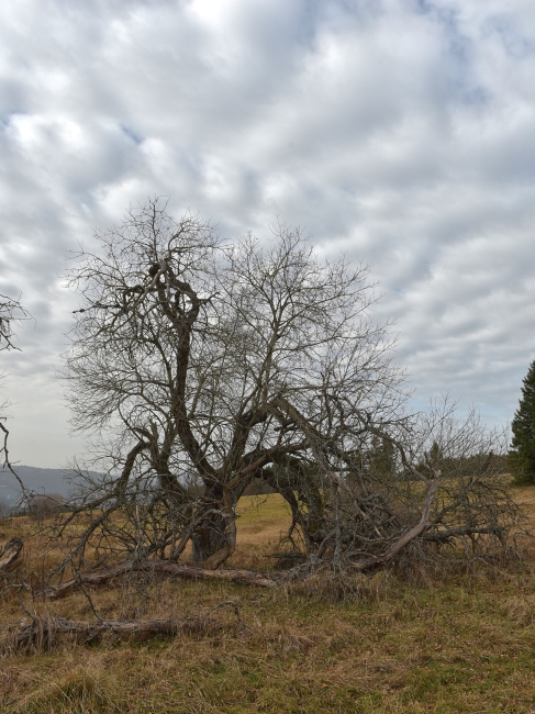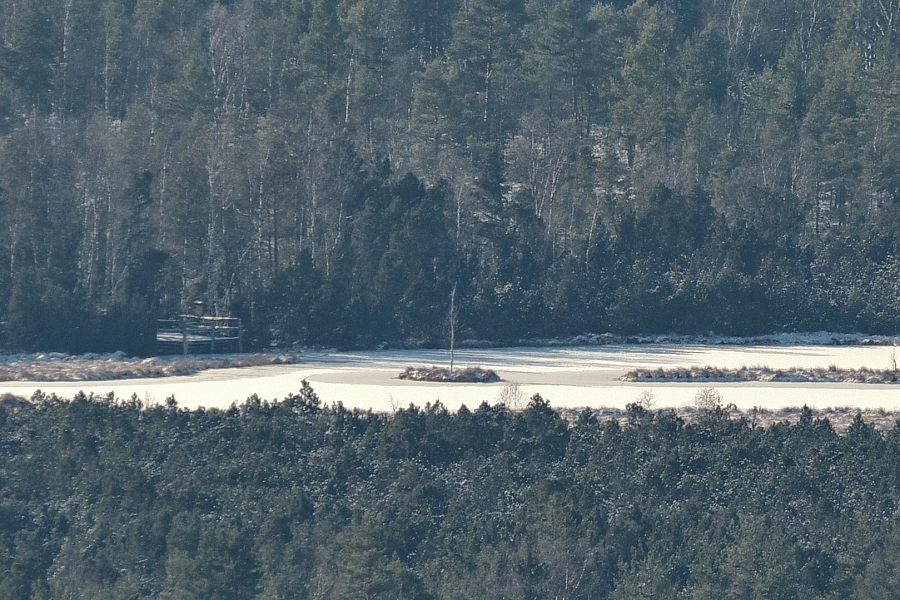 A tak se přímo nabízela realizace nápadu, inspirovaného včerejší příležitostí k neotřelému pohledu na jezírko na Chalupské slati, totiž hledat k tomu ještě výše položená místa. Stále je především nutno konstatovat, že nebýt vzpomenutého mrazíku a nedávné sněhové pokrývky, jeho hladina by se v lesích pod úbočím Vyhlídky hledala velmi obtížně, leda by pomohl formou odlesků nejlépe polední sluneční svit. Takhle se ovšem jezírko v celkovém panoramatu, orámovaném shora krom již řečeného vrcholu nad Borovými Lady dále táhlými hřbety Vysokého stolce a pod ním Kamenáče, prozradilo na první pohled bez ohledu na pozorovací čas.