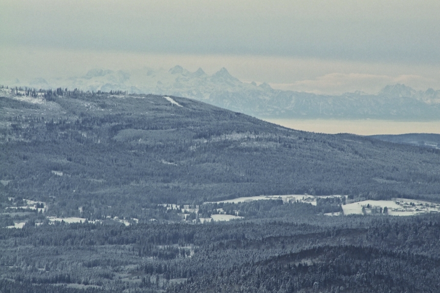Není pochyb o tom (a fotokronika to za dobu své existence bezmála osmnácti sty fotografickými výstupy svého autora dokazuje), že nejideálnější a nejpůsobivější pohled na alpské velikány se nabízel z boubínské rozhledny. Ta je bohužel (až na drobné protekční výjimky) definitivně uzavřena, byť není pochyb o tom, že navzdory vyjádření odborníků by ještě dokázala – s ohledem na výrazné zpevňující rekonstrukce uplynulých tří let – rozhodně nějaký čas bez zásadních problémů sloužit, snad jen s vyloučením velkých turistických náporů, jaké přinášívala letní sezóna nebo silvestrovské akce. Jak nás ovšem život učí, vše zlé je k něčemu dobré, …