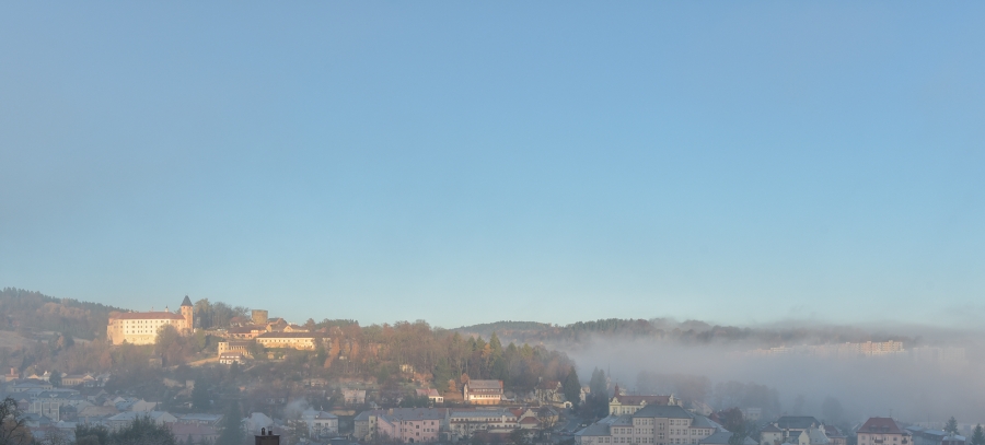 … a zdá se, že prostor by znovu mohla dostat inverze. Mlha ovšem město zatím nepohltila, jen vyčkává na obzoru.