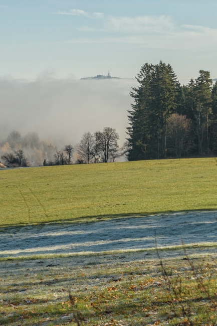 … nacházející se oproti Boubínu v méně než poloviční nadmořské výšce. Z aktuální dohlednosti bylo zřejmé, že její vyhlídkovou plošinu zasahuje spodní okraj inverzní masy …