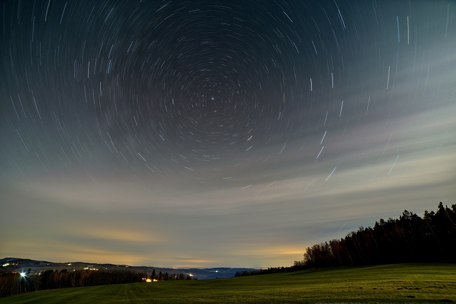 … takže nejideálnější fotografickou možností bylo osvědčené půlhodinové zachycení zemské rotace. I tam jsou stále ještě tóny polární záře patrné, třebaže již v symbióze se vzpomenutým měsíčním svitem. Tak tedy buďte přes propast věků zdráv, Mistře Galileo … ať už jste to skutečně prohlásil na adresu zabedněných tupců, kteří Vám, jak už to bývá, tím více otravovali život, čím méně Vám sahali po kotníky (ani naše doba netrpí nouzí o podobné – někteří třeba vyznávají už starověkými Řeky jasnozřivě odvrženou a vyvrácenou teorii „placaté Země“), nebo Vám ona neodmyslitelně již s Vámi spojená větička byla vložena do úst co dodatečný pseudohistorický nános, PŘECE SE TOČÍ !