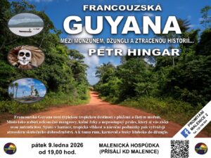 FRANCOUZSKÁ GUYANA – mezi monzunem, džunglí a (ztracenou) historií, PETR HINGAR v pátek 9. ledna 2026 od 19,00 hod v přísálí KD Malenice (Malenická Hospůdka). Francouzská Guyana není typickou tropickou