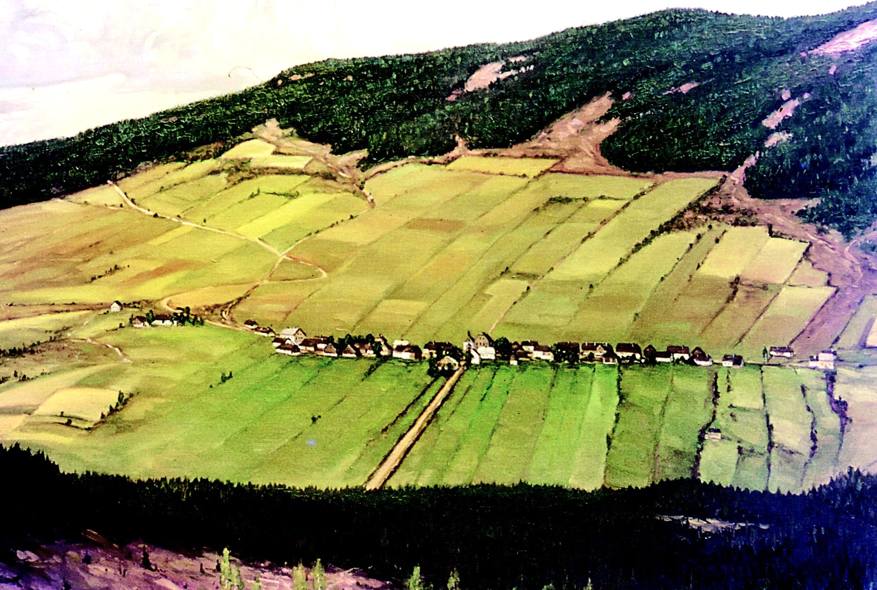 Lineární vesnice Stadln na svahu Kiesleiten, namalovaná Walterem Straubem.