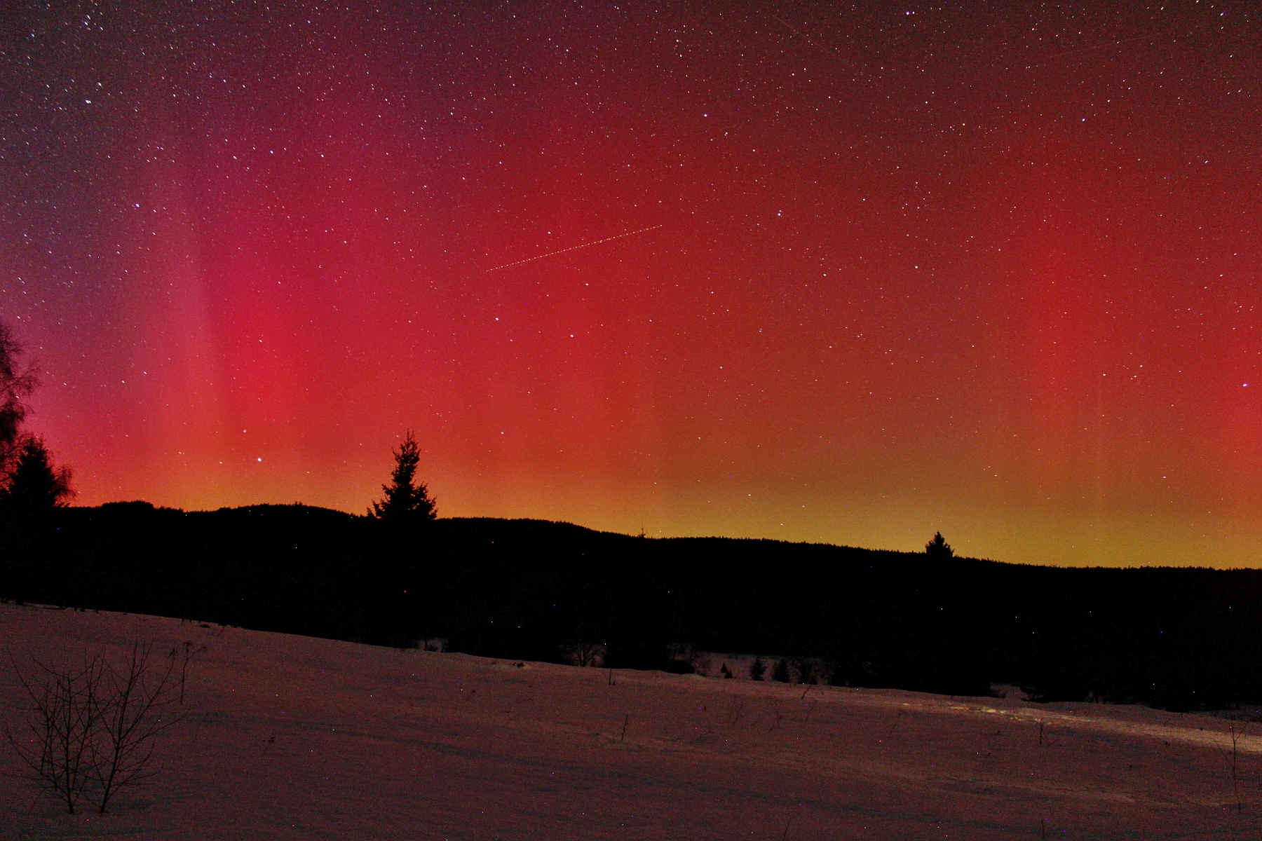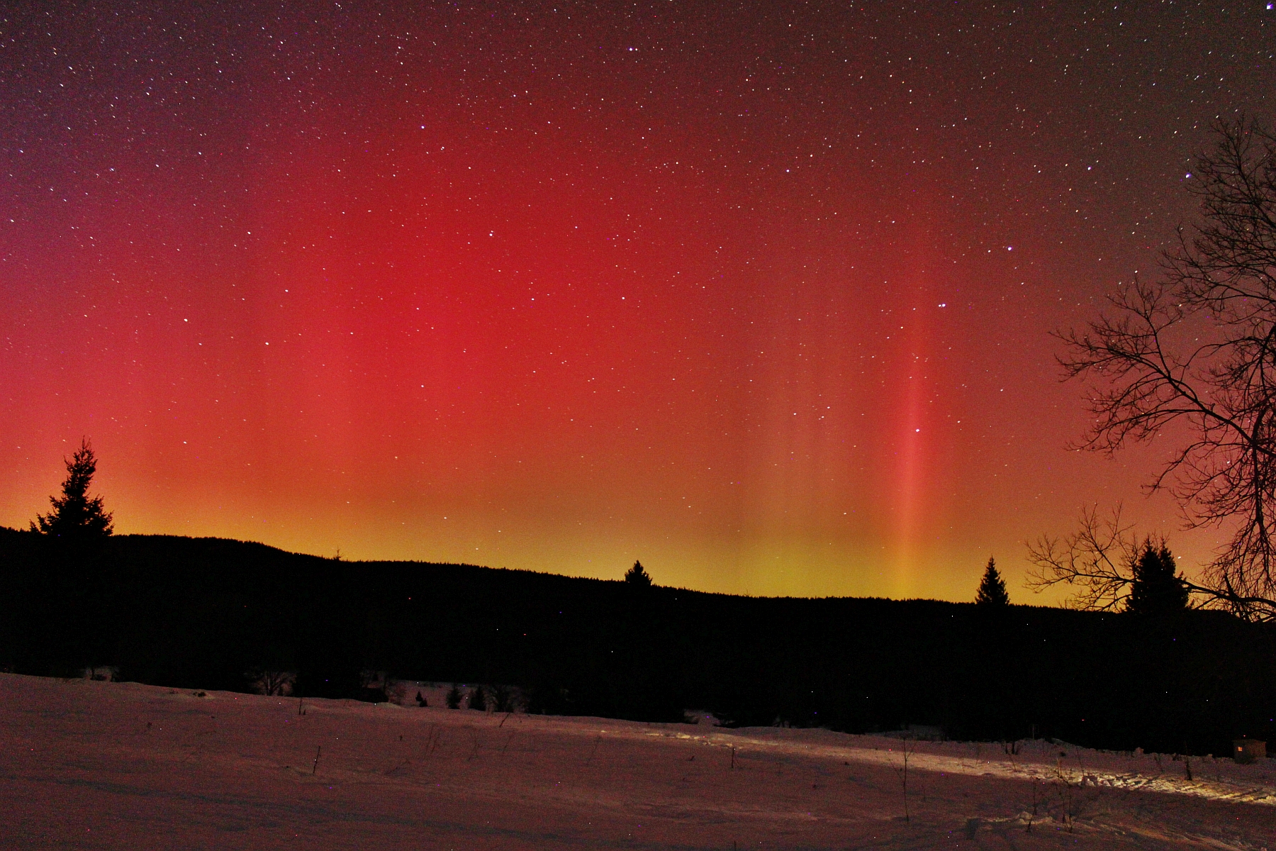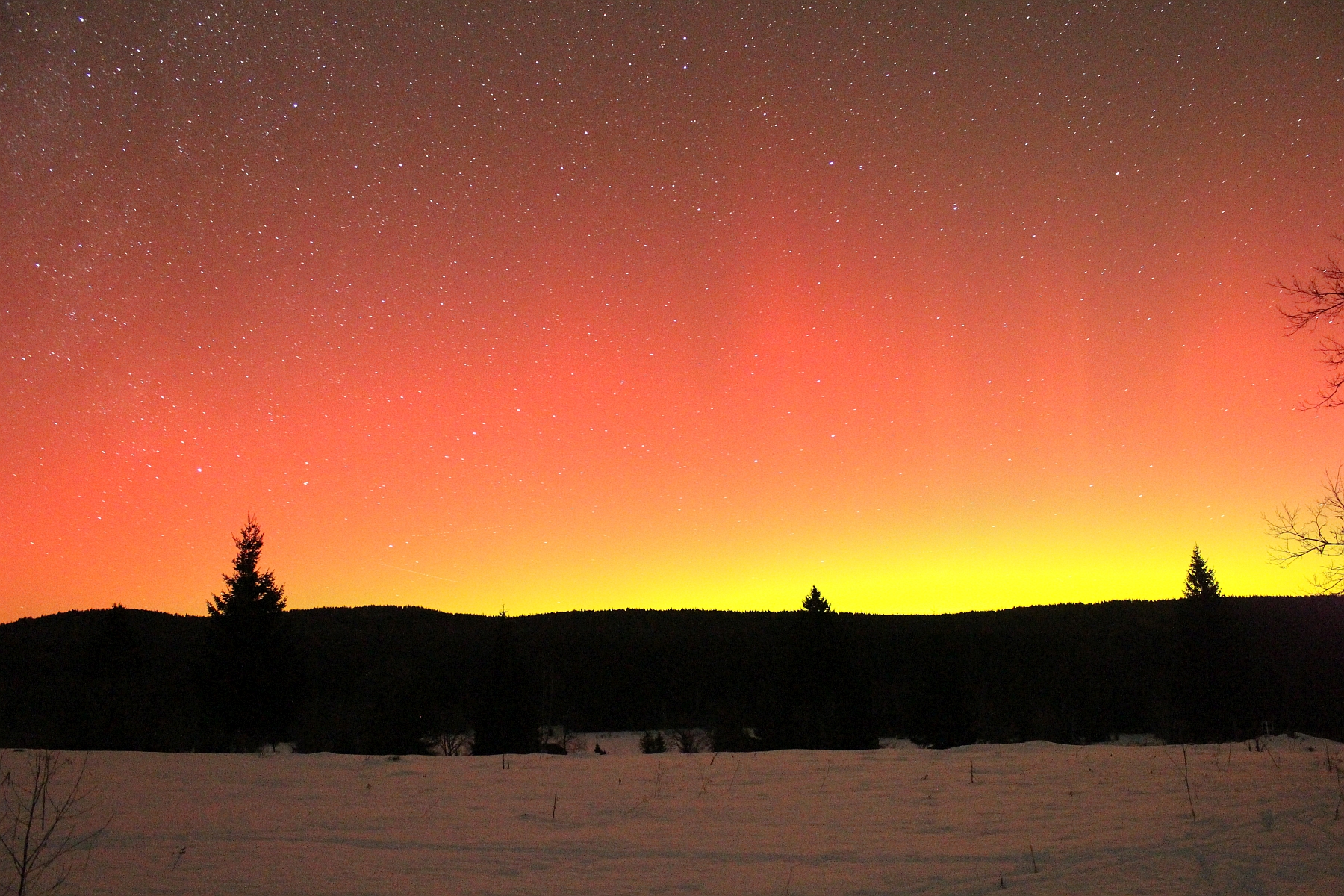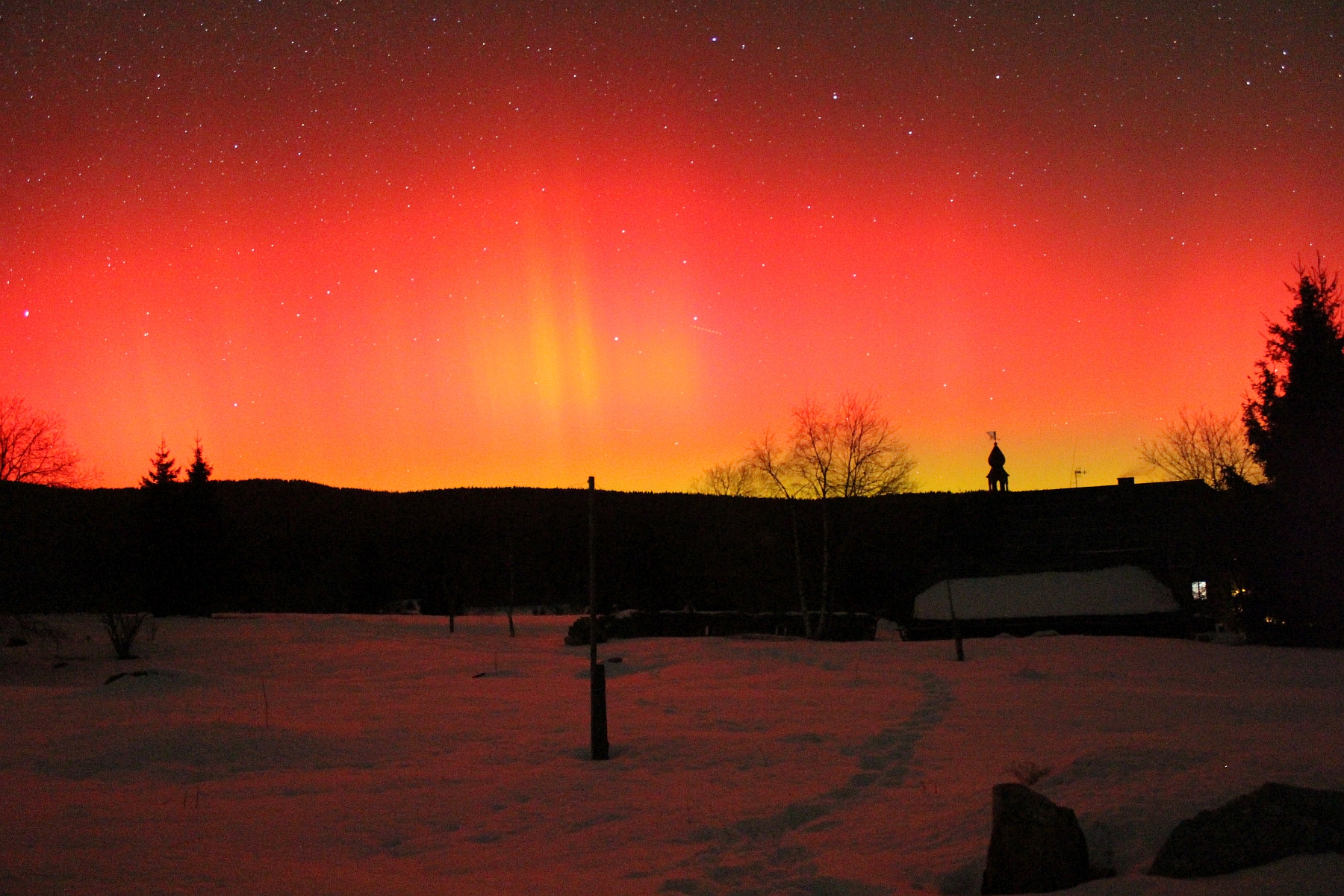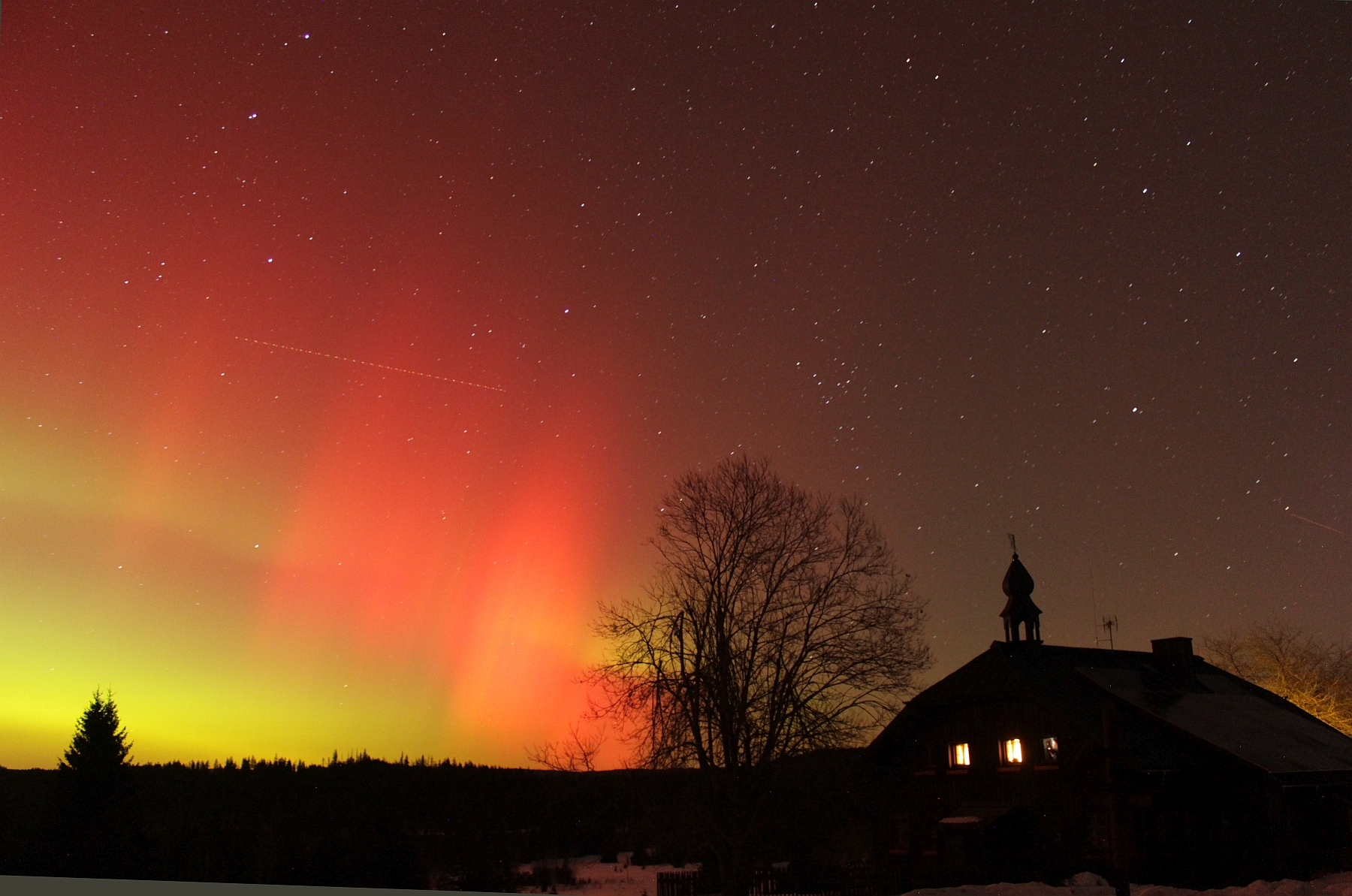 Vycházím před Hájenku. Dívám se k severu a čekám. Začíná to nenápadně nachovým přísvitem na pozadí temné oblohy. Zprvu si nejsem jist, jestli tu záři spíš jen nevábím, jestli ji vyhlížením nepřivolávám ze zatemněných nebeských komnat plných hvězd. Ale pak záře nabývá na intenzitě. Připomíná plátna Marka Rothka. Začíná se zvedat šarlatová klenba, kterou zdola prosvěcují reflektory světlejších odstínů. Chrám polární záře se zvedá. Nepotřebuje k tomu námahu mnoha paží, ať andělských či lidských. Purpurová zář prosakuje a pak se pod ní prosvětluje zelený pruh odříznutý černým obzorem lesa. Minuty plynou v očekávání. Beru si druhý svetr, teplota již určitě klesla pod -10 °C a já stojím na místě a rychle prochládám. Ale odejít nechci. Vtom se výš nad rudou základnou rychle provaluje pás světlých skvrn. Nalévají se sytou světlou zelení a protahují od západu přes sever až k východu jako pomalý příboj. Narůstají jedna za druhou, stačí jim pár sekund a opět zhasínají.