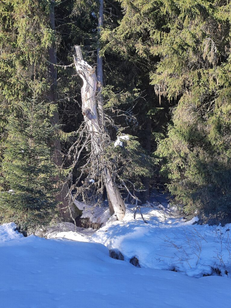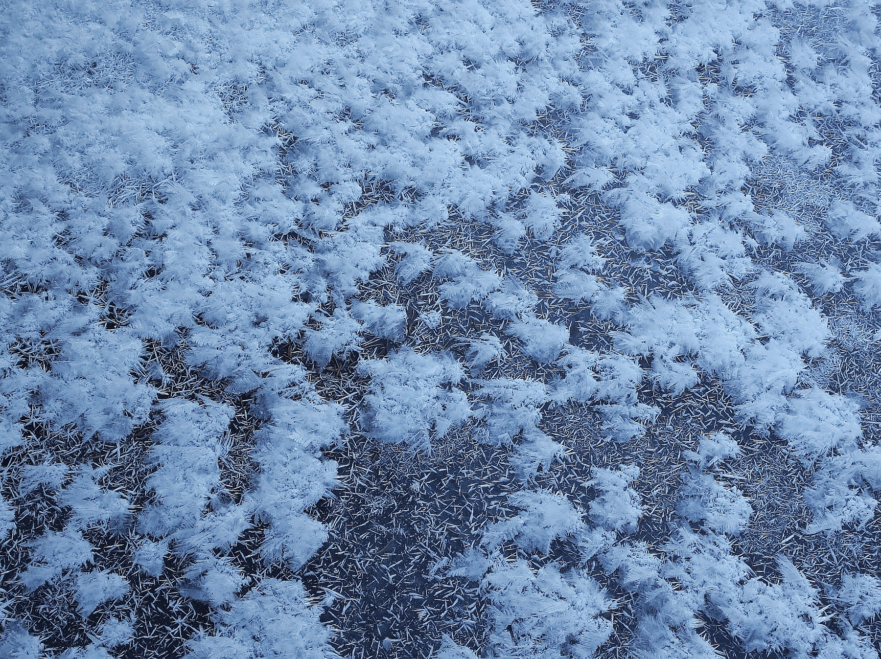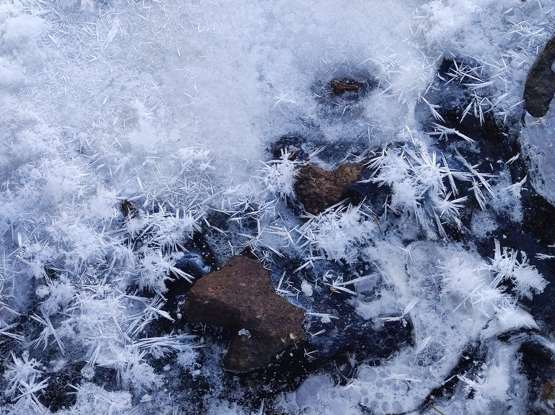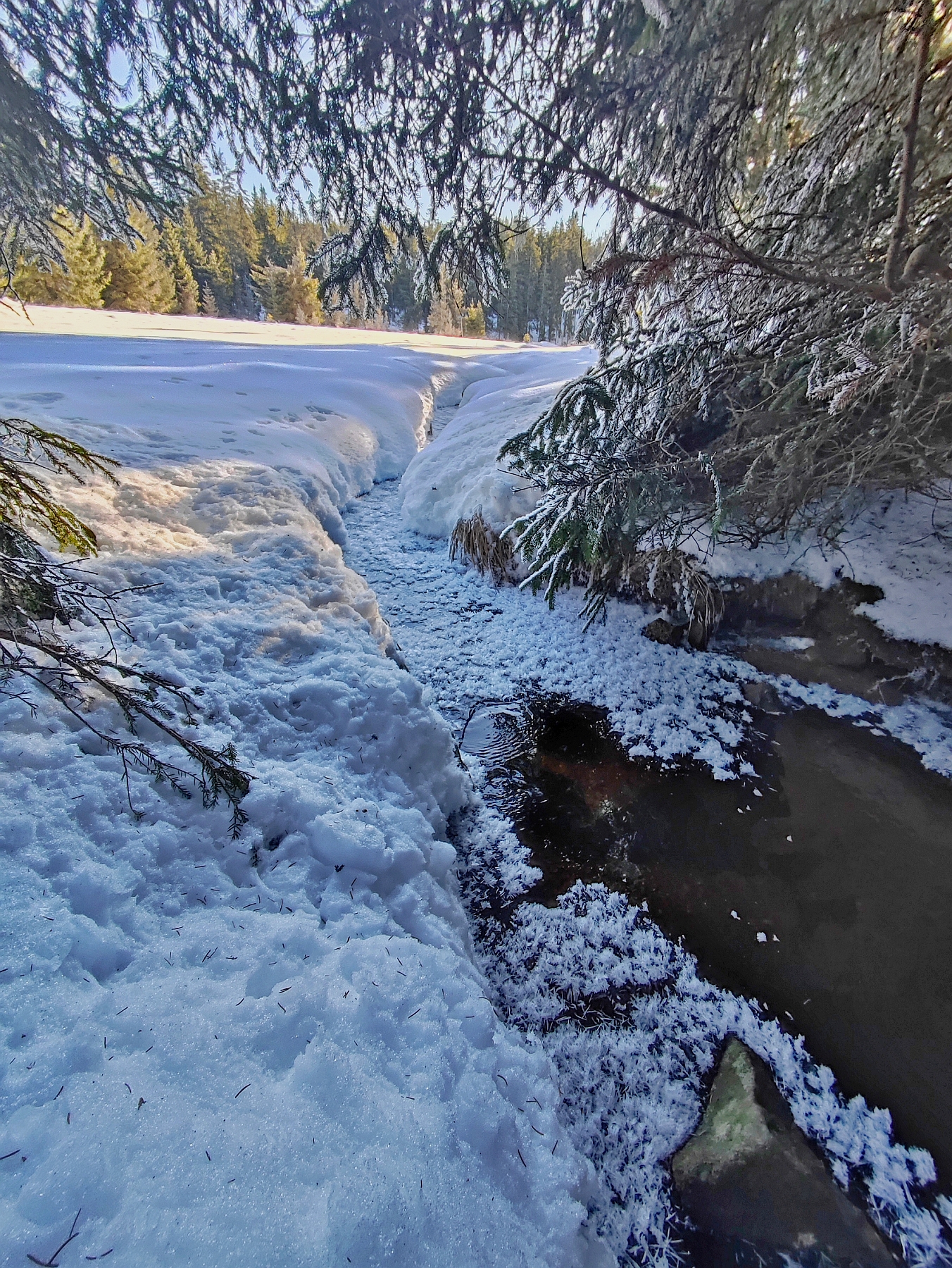 Sníh je tu hlubší, než jsem předpokládal. A u hranice má na sobě ledovou krustu. Zakopnu o ni a už jsem na všech čtyřech a ne a ne se zvednout. Rukou se nemám jak opřít, hned se propadá. A v nohách nemám dostatek sil. Nakonec se přece jen vzchopím a stojím. Fotím Flexaretou holé torzo smrku, ke kterému se občas vracím jako k mudrci pro radu. Vybaví se mi dvojverší básníka Petra Kabeše: ještě ne otázka / a už ne odpověď. Docházím k hranici, ke křížku u mostku, pod nímž protéká na bavorskou stranu Červený potok. Břehy a kameny jsou pokryté bohatou jinovatkou. Je jisté, že pod mostkem protéká ledový vzduch z louky, která na české straně vytváří mělké údolí. Klasická mrazová kotlinka. Krystaly neuvěřitelně citlivé na světlo, se třpytí i v hustém stínu pod smrkem, stačí jen trocha slunečního svitu, ihned mu odpoví prachem zrcadel.