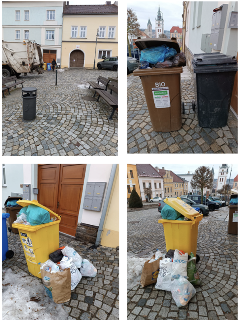 Velice by mě zajímalo, kdo má toto rozhodnutí na svědomí. Z právního hlediska se jeví, že dochází k diskriminaci části obyvatel tím, že znevýhodňuje část občanů v poskytování služeb, které si ovšem zaplatili v plné výši. Tímto jednáním je možné, že dochází i k nedovolenému obohacování. Pokud radní plánovali tento postup již dopředu a měli rozdělené město do dvou kategorií, proč se cena za popelnice podle tohoto plánu neupravila? K samotnému vyvážení odpadu jsem dostal 4 fotografie pořízené na náměstí Svobody ve stejný čas. Z fotek je patrné, že ne všechny popelnice jsou vyvezeny. Jaký je důvod?