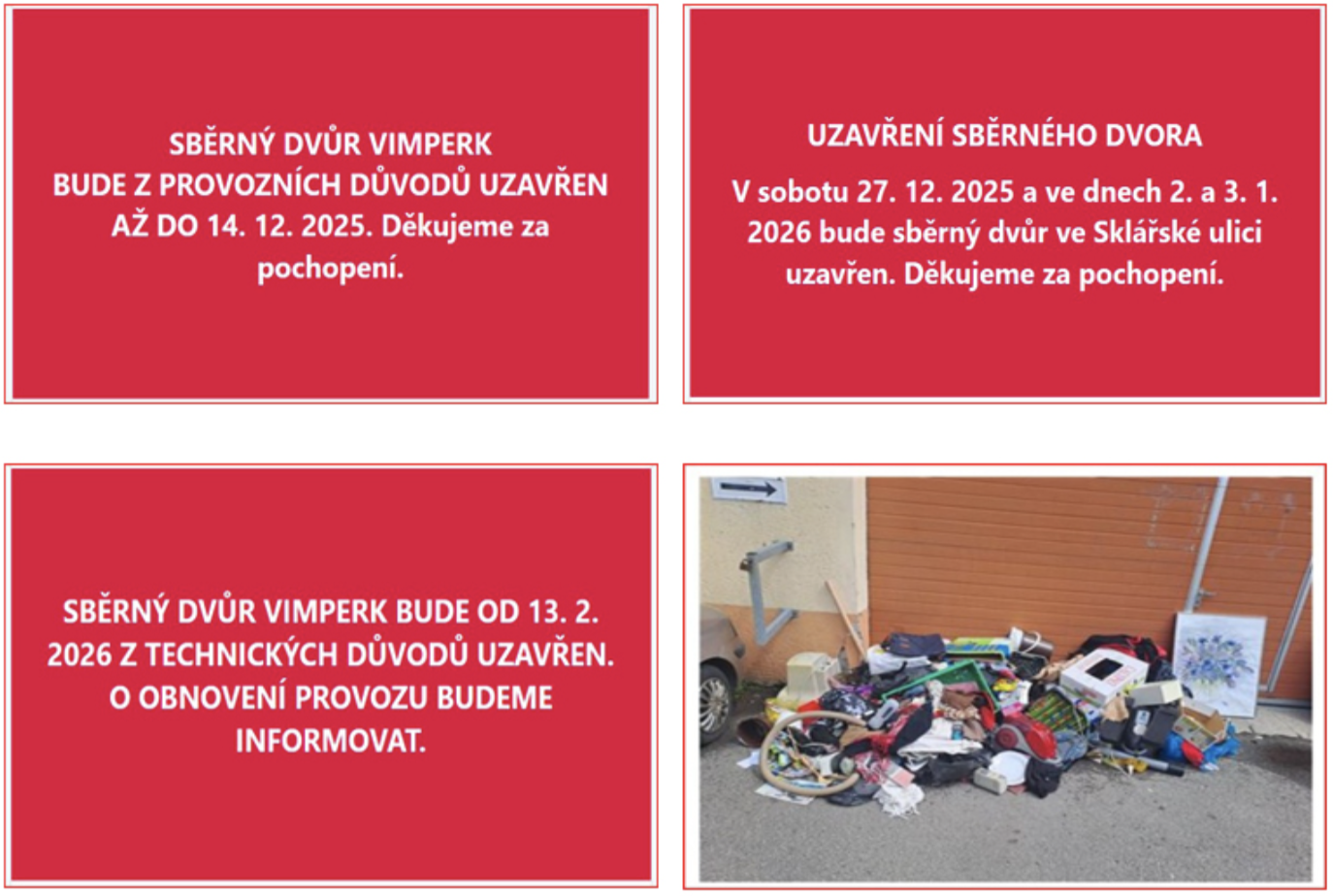 Další položkou v platbě za popelnice je i provoz sběrného dvora. Jelikož jeho provoz platím i já, tak bych chtěl vědět víc o jeho problémech, které se skrývají za obecnou frází „Z provozních či technických důvodů bude zavřeno“ a stejně bych chtěl vědět, kdy tyto důvody pominou. Z následných fotek je patrné, že by mohl být v době nepřítomnosti zaměstnanců k dispozici externí kontejner, který by sloužil občanům k odložení nepotřebných věcí, když se netrefí do otvírací doby. Jak můžete z následujících informací FB Město Vimperk zjistit, že není moc otevřený.