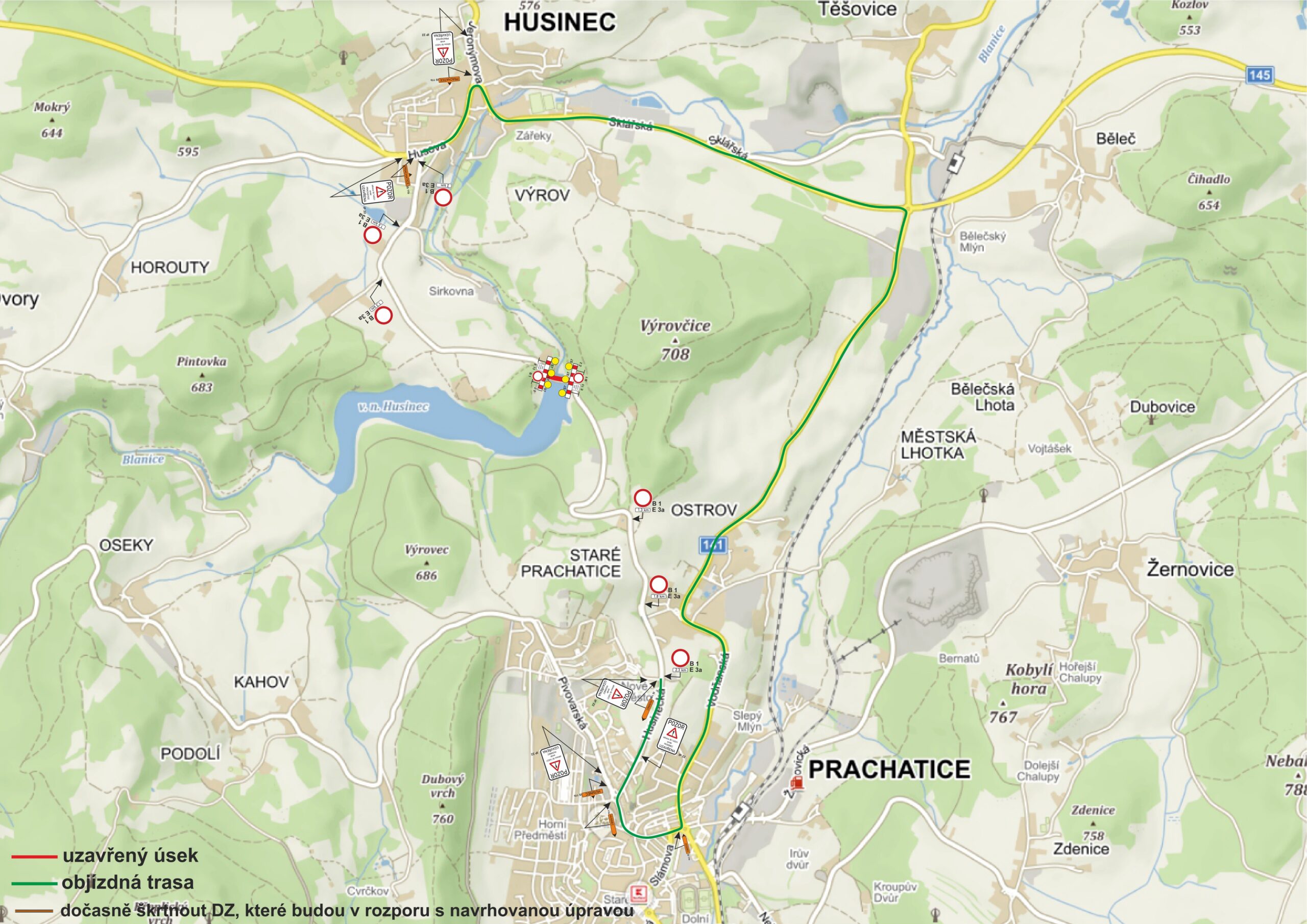 Důvodem uzavírky je realizace stavby: Blanice, ř. km 57,588, VD Husinec – oprava mostovky. Objížďka bude vedena po silnici II/145 (Husinec), po silnici II/141 (Husinec – kruhová křižovatka u Těšovic – Prachatice). Uzavřený úsek silnice a objízdná trasa jsou vyznačeny v přiloženém dopravně inženýrském opatření (DIO).