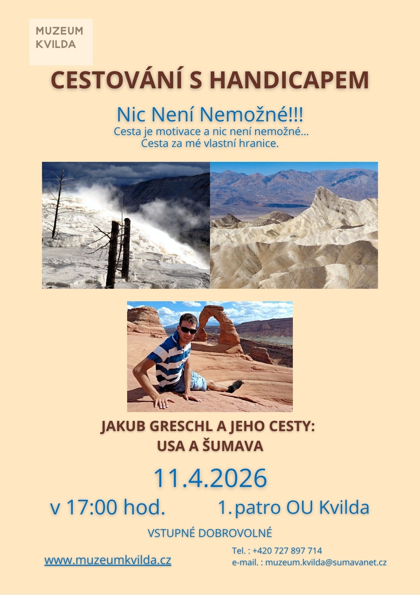 – 11.4. od 17:00 proběhne přednáška na téma Cestování s handicapem, USA a Šumava – Nic není nemožné! Pod vedením Jakuba Greschla
