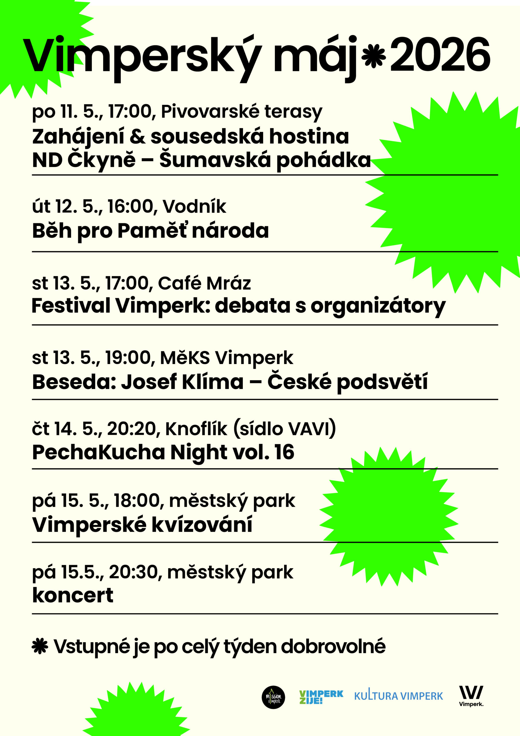 Květen ve Vimperku bude opět patřit kultuře. Připravili jsme pro vás přehled plakátů a pozvánek na koncerty, výstavy, besedy i další akce, které oživí dny a večery ve městě.