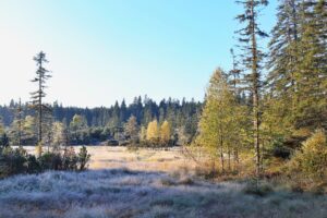 Cíl Slať Malý Polec zasypal ledový prach jíní. Teplota při zemi klesla na -8 °C. Mlčky žloutnou břízy, svítí v temně zelené kosodřeviny, přišel jejich