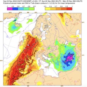 Teploty jsou v mnoha oblastech v červeně označené zóně historicky vysoké. EFI (Index extrémní předpovědi) od ECMWF je prakticky mimo stupnici. Mezitím panuje v Turecku