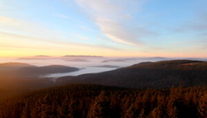Dnešní východ slunce na Šumavě byl dechberoucí. Obzor se zvolna rozhořel do odstínů růžové, zlaté a oranžové, zatímco z údolí se tiše zvedala mlha. Lesy