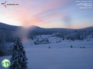 Zimní počasí pokračovalo na Šumavě po celý týden. Po vydatném sněžení, které ustalo v noci na pátek došlo o víkendu k částečnému zmenšení oblačnosti pouze