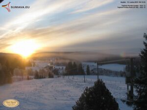 Zima se po delší pauze vrátila na Šumavu. Nejhezčí záběry z webkamer za uplynulý týden tak nabízí pohledy na zasněženou Šumavu, nechybí nádherné východy slunce
